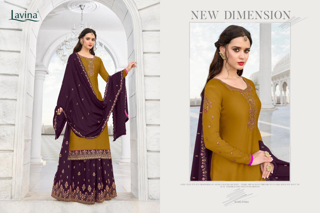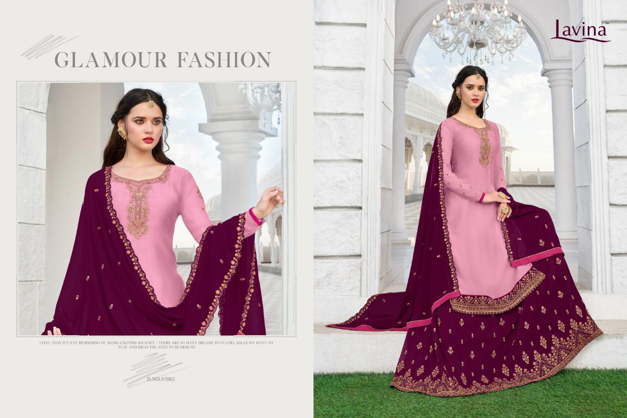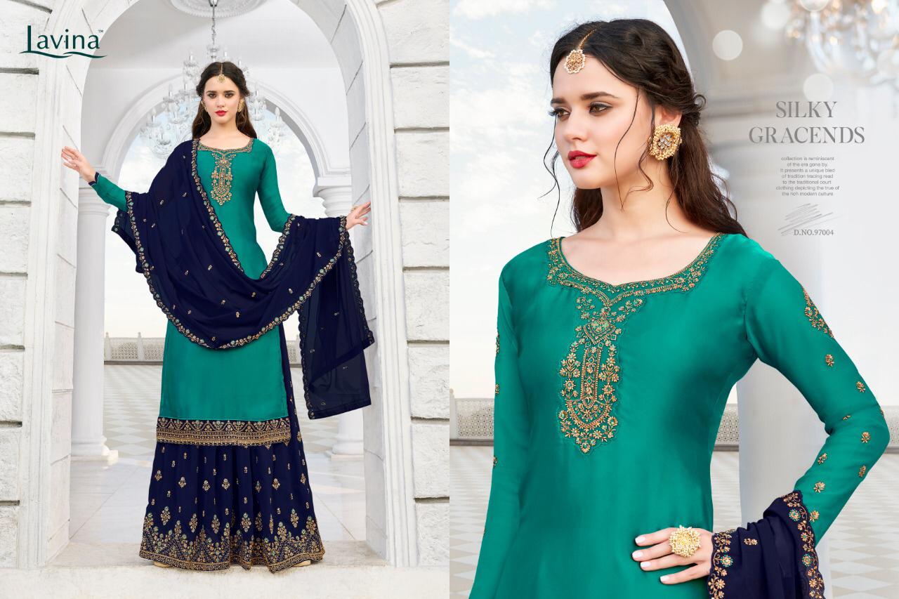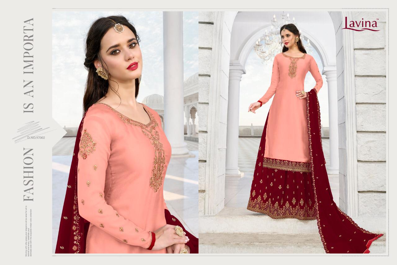 Buy Online Lavina 97 Nx Series 97001 To 97005 Designer Party Wear Suits Wholesale Supplier Gujarat 5 Pcs of Full Catalogue at Wholesale Price. Looking for Lavina 97 Nx Series 97001 To 97005 Designer Party Wear Suits Wholesale Supplier Gujarat Full Catalouge at Best Price? Buy Now Lavina 97 Nx Series 97001 To 97005 Designer Party Wear Suits Wholesale Supplier Gujarat at Wholesale Rate of Rs 10495 with Total 5 Pcs from authroized dealer and supplier of LAVINA Brand. Cost of Each piece is just only Rs 2099 which is very low and affordable price to resale the product in your retail store ,This is Surat based Wholesale Supplier & Dealer of LAVINA Brand. Click on Brand name to Know more about LAVINA Brand's products.Call or Whatsapp on 9898838984 for booking or enquiry
