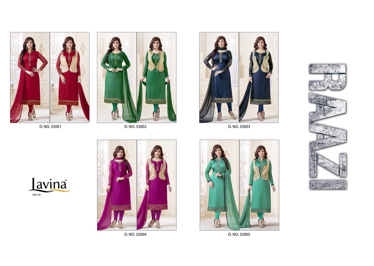 Buy Online Lavina Raazi Vol 33 Satin Georgette With Embroidered Koti Designer Party Wear Suits Wholesale Supplier And Dealer Nityanx Surat 5 Pcs of Full Catalogue at Wholesale Price. Looking for Lavina Raazi Vol 33 Satin Georgette With Embroidered Koti Designer Party Wear Suits Wholesale Supplier And Dealer Nityanx Surat Full Catalouge at Best Price? Buy Now Lavina Raazi Vol 33 Satin Georgette With Embroidered Koti Designer Party Wear Suits Wholesale Supplier And Dealer Nityanx Surat at Wholesale Rate of Rs 7470 with Total 5 Pcs from authroized dealer and supplier of LAVINA Brand. Cost of Each piece is just only Rs 1494 which is very low and affordable price to resale the product in your retail store ,This is Surat based Wholesale Supplier & Dealer of LAVINA Brand. Click on Brand name to Know more about LAVINA Brand's products.Call or Whatsapp on 9898838984 for booking or enquiry