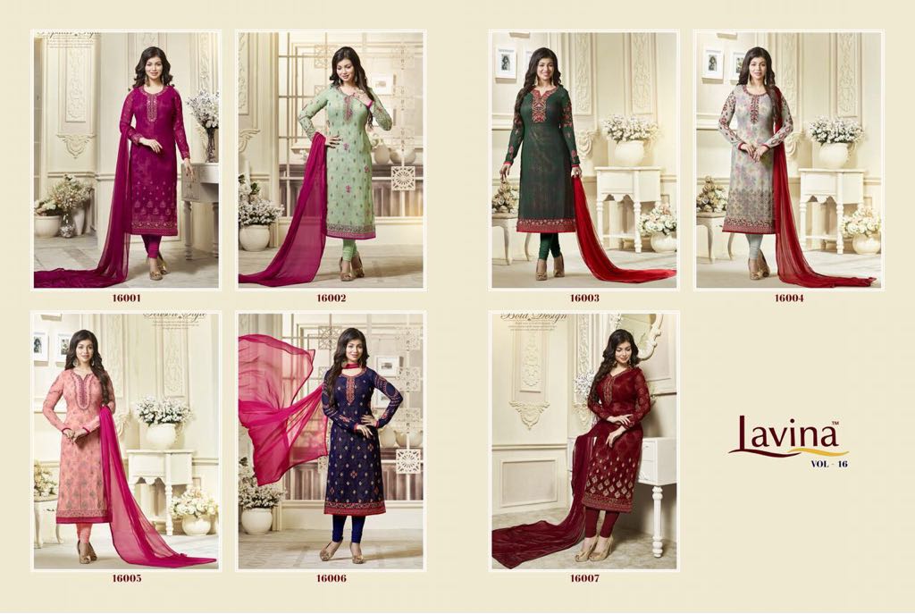 Buy Online Lavina Vol 16 16001 Series Fancy Georgette Party Wear Suit 7 Pcs of Full Catalogue at Wholesale Price. Looking for Lavina Vol 16 16001 Series Fancy Georgette Party Wear Suit Full Catalouge at Best Price? Buy Now Lavina Vol 16 16001 Series Fancy Georgette Party Wear Suit at Wholesale Rate of Rs 9380 with Total 7 Pcs from authroized dealer and supplier of LAVINA Brand. Cost of Each piece is just only Rs 1340 which is very low and affordable price to resale the product in your retail store ,This is Surat based Wholesale Supplier & Dealer of LAVINA Brand. Click on Brand name to Know more about LAVINA Brand's products.Call or Whatsapp on 9898838984 for booking or enquiry