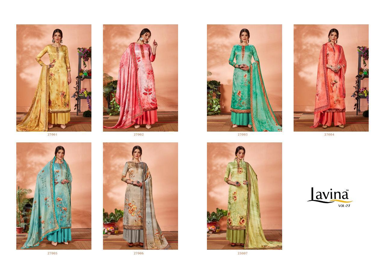 Buy Online Lavina Vol 27 Series 27001 To 27007 Designer Party Wear Suits Wholesale Supplier Gujarat 7 Pcs of Full Catalogue at Wholesale Price. Looking for Lavina Vol 27 Series 27001 To 27007 Designer Party Wear Suits Wholesale Supplier Gujarat Full Catalouge at Best Price? Buy Now Lavina Vol 27 Series 27001 To 27007 Designer Party Wear Suits Wholesale Supplier Gujarat at Wholesale Rate of Rs 6993 with Total 7 Pcs from authroized dealer and supplier of LAVINA Brand. Cost of Each piece is just only Rs 999 which is very low and affordable price to resale the product in your retail store ,This is Surat based Wholesale Supplier & Dealer of LAVINA Brand. Click on Brand name to Know more about LAVINA Brand's products.Call or Whatsapp on 9898838984 for booking or enquiry