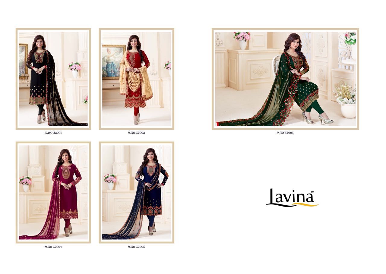 Buy Online Lavina Vol 32 Georgette Embroidered Designer Party Wear Suits Wholesale Supplier And Dealer Surat 8 Pcs of Full Catalogue at Wholesale Price. Looking for Lavina Vol 32 Georgette Embroidered Designer Party Wear Suits Wholesale Supplier And Dealer Surat Full Catalouge at Best Price? Buy Now Lavina Vol 32 Georgette Embroidered Designer Party Wear Suits Wholesale Supplier And Dealer Surat at Wholesale Rate of Rs 14440 with Total 8 Pcs from authroized dealer and supplier of LAVINA Brand. Cost of Each piece is just only Rs 1805 which is very low and affordable price to resale the product in your retail store ,This is Surat based Wholesale Supplier & Dealer of LAVINA Brand. Click on Brand name to Know more about LAVINA Brand's products.Call or Whatsapp on 9898838984 for booking or enquiry