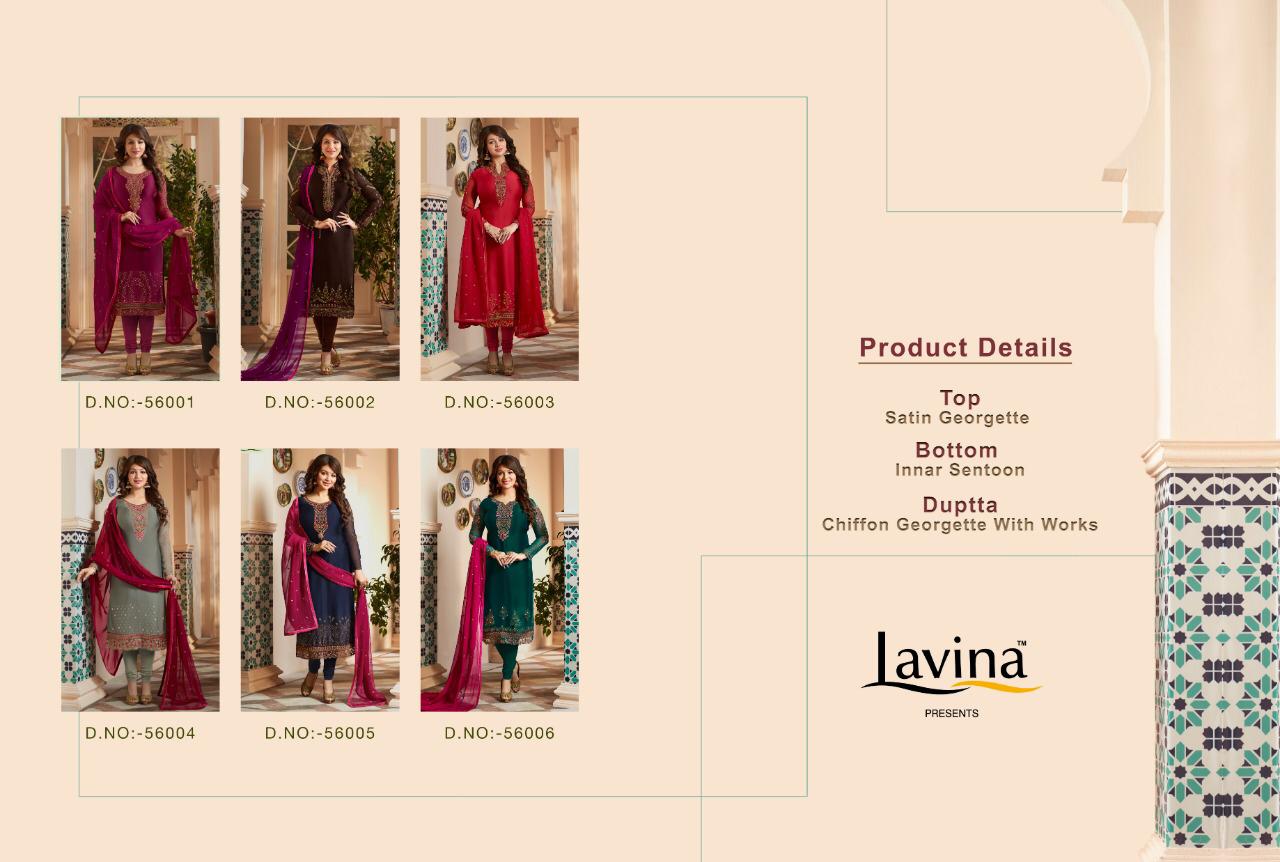 Buy Online Lavina Vol 56 Series 56001 To 56006 Satin Georgette Embroidered Designer Party Wear Suits Wholesale Supplier India 6 Pcs of Full Catalogue at Wholesale Price. Looking for Lavina Vol 56 Series 56001 To 56006 Satin Georgette Embroidered Designer Party Wear Suits Wholesale Supplier India Full Catalouge at Best Price? Buy Now Lavina Vol 56 Series 56001 To 56006 Satin Georgette Embroidered Designer Party Wear Suits Wholesale Supplier India at Wholesale Rate of Rs 9570 with Total 6 Pcs from authroized dealer and supplier of LAVINA Brand. Cost of Each piece is just only Rs 1595 which is very low and affordable price to resale the product in your retail store ,This is Surat based Wholesale Supplier & Dealer of LAVINA Brand. Click on Brand name to Know more about LAVINA Brand's products.Call or Whatsapp on 9898838984 for booking or enquiry