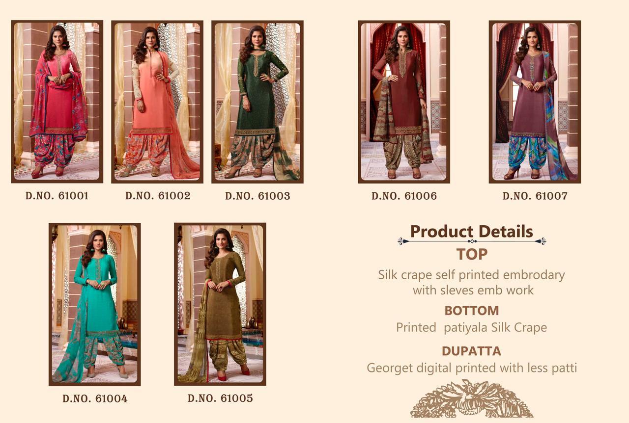 Buy Online Lavina Vol 61 Silkina Patiyala Series 61001 To 61007 Crape Digital Printed Suits Wholesale Supplier Gujarat 7 Pcs of Full Catalogue at Wholesale Price. Looking for Lavina Vol 61 Silkina Patiyala Series 61001 To 61007 Crape Digital Printed Suits Wholesale Supplier Gujarat Full Catalouge at Best Price? Buy Now Lavina Vol 61 Silkina Patiyala Series 61001 To 61007 Crape Digital Printed Suits Wholesale Supplier Gujarat at Wholesale Rate of Rs 7525 with Total 7 Pcs from authroized dealer and supplier of LAVINA Brand. Cost of Each piece is just only Rs 1075 which is very low and affordable price to resale the product in your retail store ,This is Surat based Wholesale Supplier & Dealer of LAVINA Brand. Click on Brand name to Know more about LAVINA Brand's products.Call or Whatsapp on 9898838984 for booking or enquiry