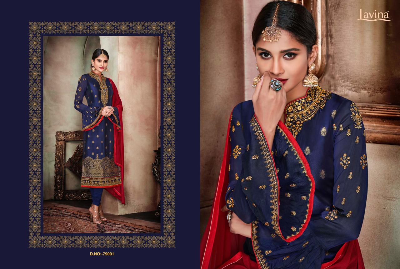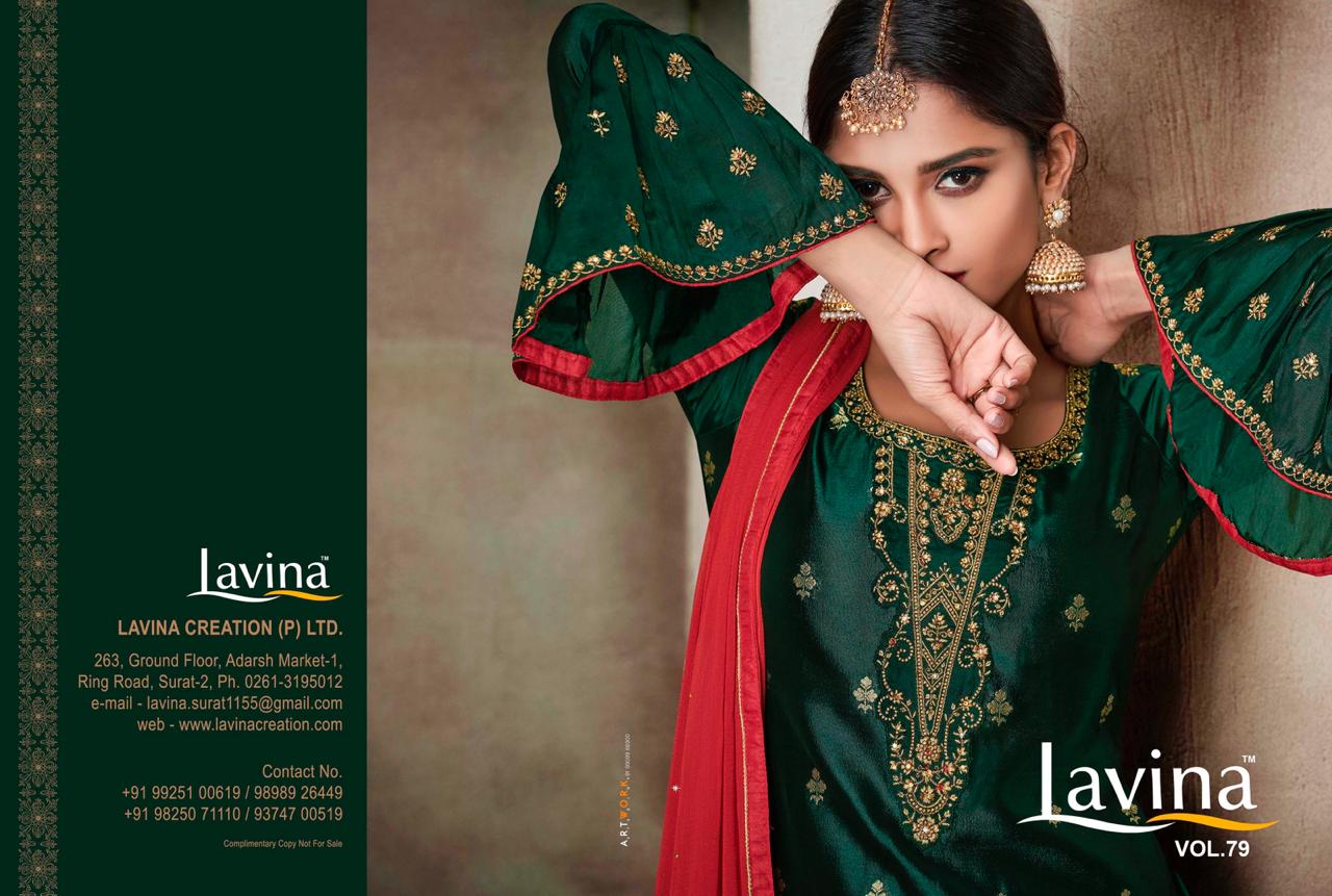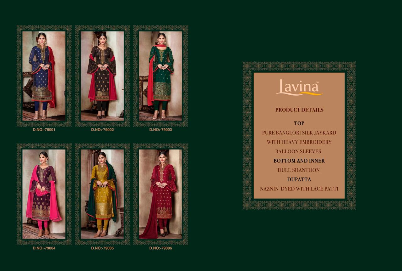 Buy Online Lavina Vol 79 Series 79001 To 79006 Banarasi Jaquard Suits Wholesale Supplier Gujarat 6 Pcs of Full Catalogue at Wholesale Price. Looking for Lavina Vol 79 Series 79001 To 79006 Banarasi Jaquard Suits Wholesale Supplier Gujarat Full Catalouge at Best Price? Buy Now Lavina Vol 79 Series 79001 To 79006 Banarasi Jaquard Suits Wholesale Supplier Gujarat at Wholesale Rate of Rs 10170 with Total 6 Pcs from authroized dealer and supplier of LAVINA Brand. Cost of Each piece is just only Rs 1695 which is very low and affordable price to resale the product in your retail store ,This is Surat based Wholesale Supplier & Dealer of LAVINA Brand. Click on Brand name to Know more about LAVINA Brand's products.Call or Whatsapp on 9898838984 for booking or enquiry