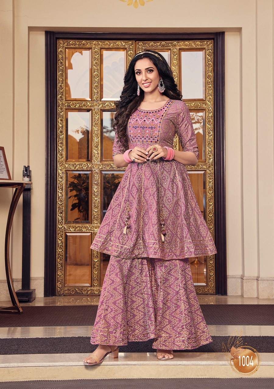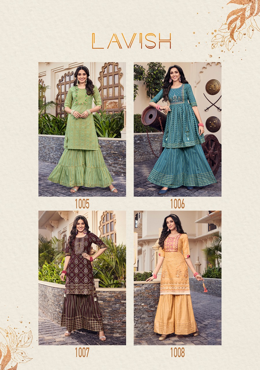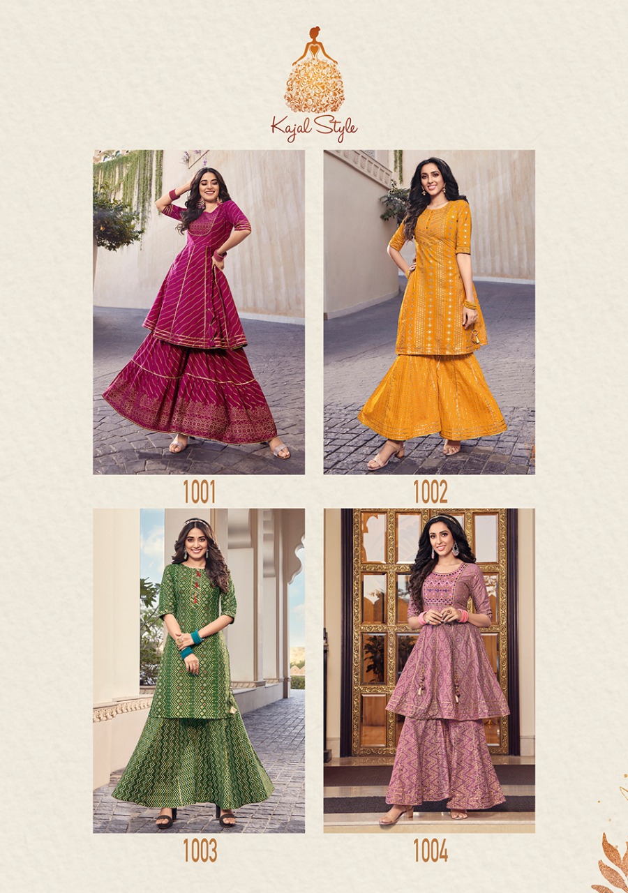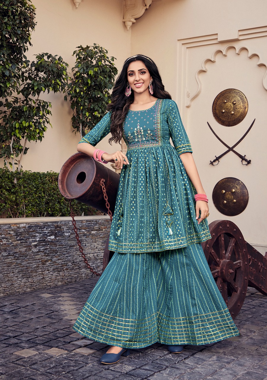 ? ? ? *KAJAL STYLE* Catalogue name: ? *Lavish Vol.1* ? (Kurti & Sharara) ?Details: ?Pattern :- *Kurti with Flair Sharara* ?Fabrics - *?? Heavy Cotton* *?? Fancy Embroidery work* *?? Classy Prints* ?Size - *S M L XL 2XL 3XL 4XL* ? Length Â?> *38 to 40* ?Designs - *8?? pcs* *RATE :- 8??4??9?? + GST* ??????hurryyy uppp....Book your order now...????????? Regards, *-VARNIRAJ INDUSTRIES PVT LTD-* |