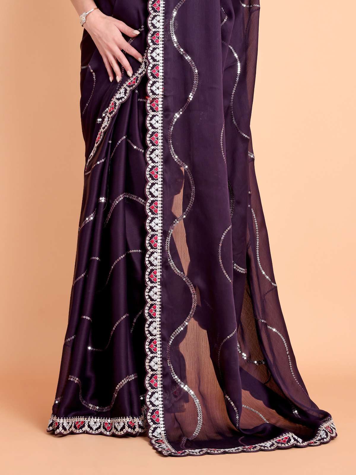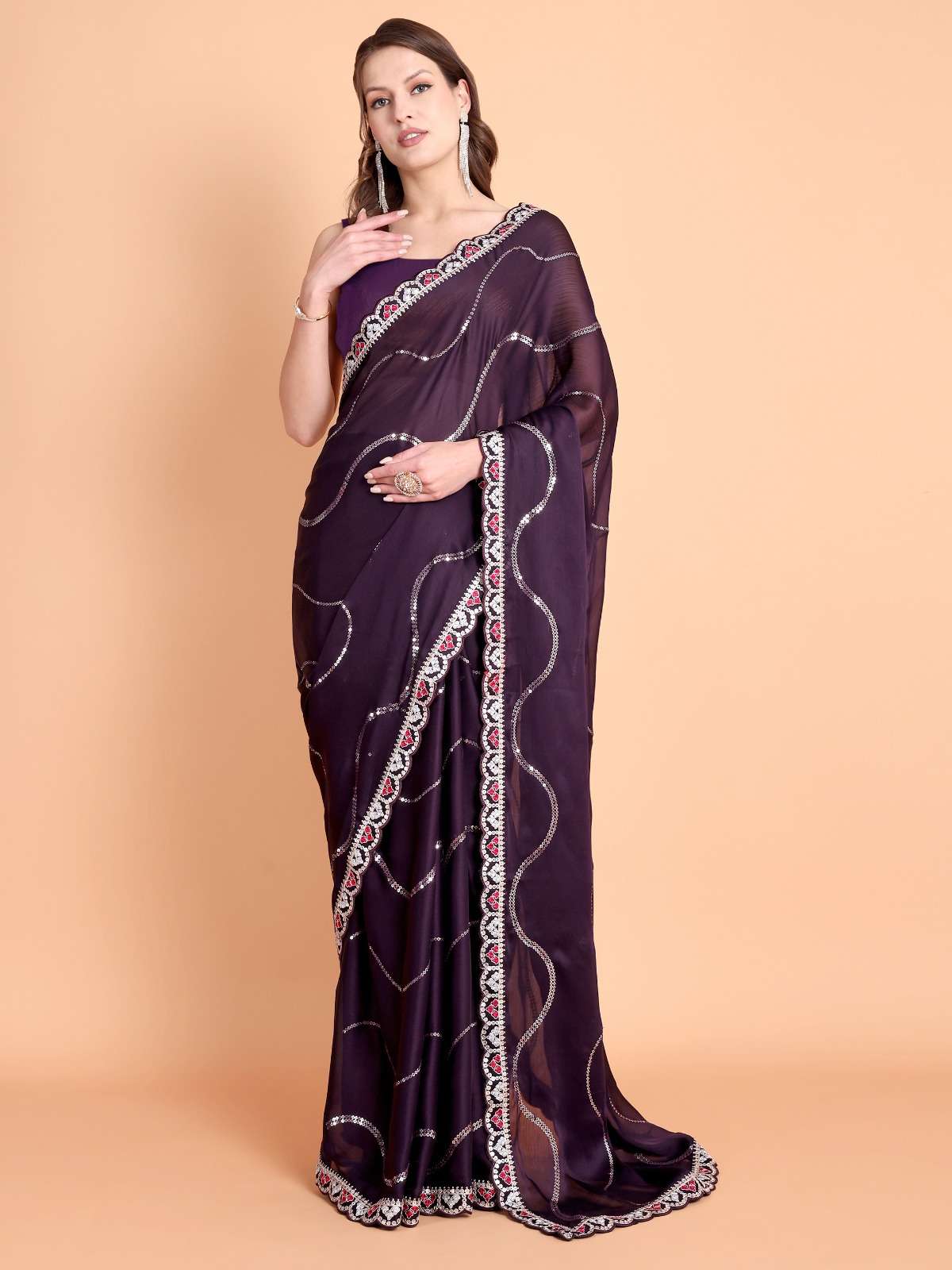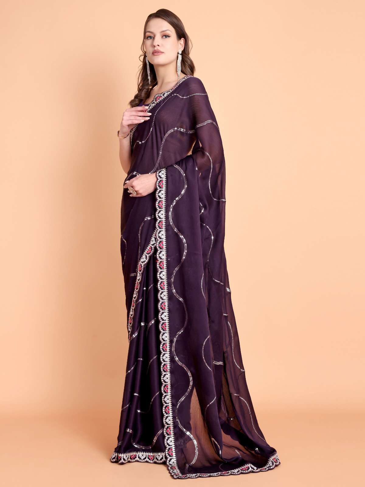 Catalog Name : *Laxmibai* No of Pcs : 1 Fabric : georgate Work : Blooming Georgette crush saree with coding sequence on all over the saree with Cut work sequence border on border *Blouse will be come in satin banglori fabric same color in all sarees*