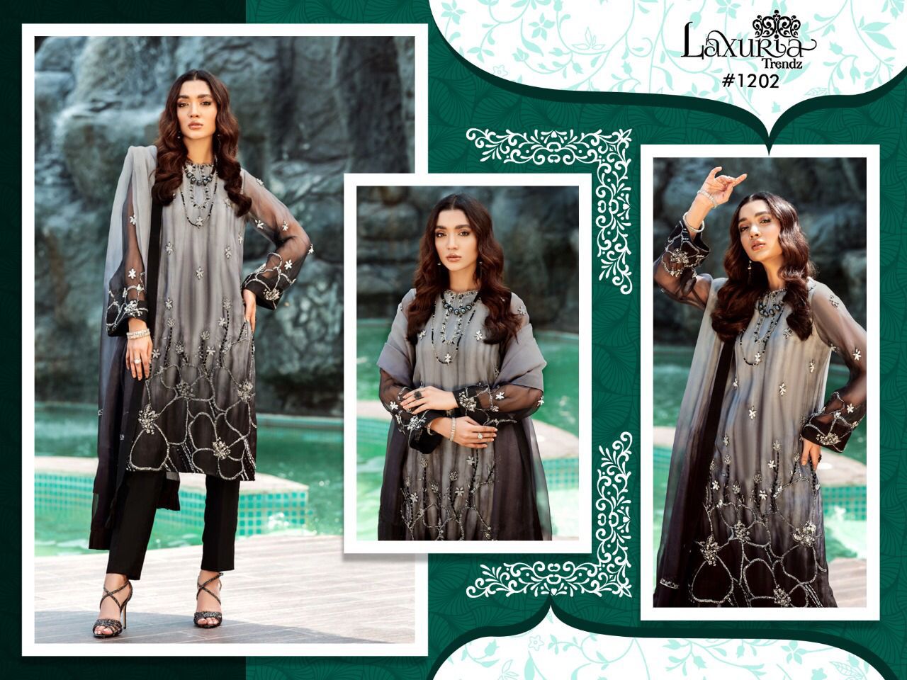 Buy Online Laxuria Trendz D No 1202 Top Bottom With Dupatta Pakistani Collection Manufacturer Traders And Dealer From India 5 Pcs of Full Catalogue at Wholesale Price. Looking for Laxuria Trendz D No 1202 Top Bottom With Dupatta Pakistani Collection Manufacturer Traders And Dealer From India Full Catalouge at Best Price? Buy Now Laxuria Trendz D No 1202 Top Bottom With Dupatta Pakistani Collection Manufacturer Traders And Dealer From India at Wholesale Rate of Rs 7495 with Total 5 Pcs from authroized dealer and supplier of Brand. Cost of Each piece is just only Rs 1499 which is very low and affordable price to resale the product in your retail store ,This is Surat based Wholesale Supplier & Dealer of Brand. Click on Brand name to Know more about Brand's products.Call or Whatsapp on 9898838984 for booking or enquiry