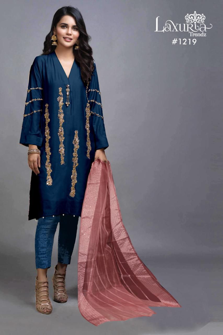 Buy Online Laxuria Trendz D No 1219 Pret Collection 4 Pcs of Full Catalogue at Wholesale Price. Looking for Laxuria Trendz D No 1219 Pret Collection Full Catalouge at Best Price? Buy Now Laxuria Trendz D No 1219 Pret Collection at Wholesale Rate of Rs 6000 with Total 4 Pcs from authroized dealer and supplier of Brand. Cost of Each piece is just only Rs 1500 which is very low and affordable price to resale the product in your retail store ,This is Surat based Wholesale Supplier & Dealer of Brand. Click on Brand name to Know more about Brand's products.Call or Whatsapp on 9898838984 for booking or enquiry