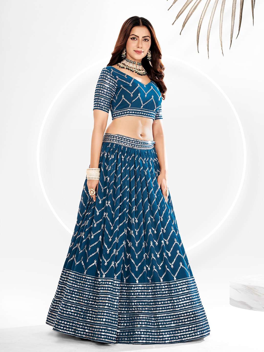 *Lehenga(Semi - Stitched)* Lehenga Fabric : Georgette Lehenga Work : Sequins and embroidery Work Lehenga Waist : Support Up To 44 Stitching : stitching with Canvas and Can-Can Length : 43 Flair : 3.50 Mtr Inner : Micro Cotton