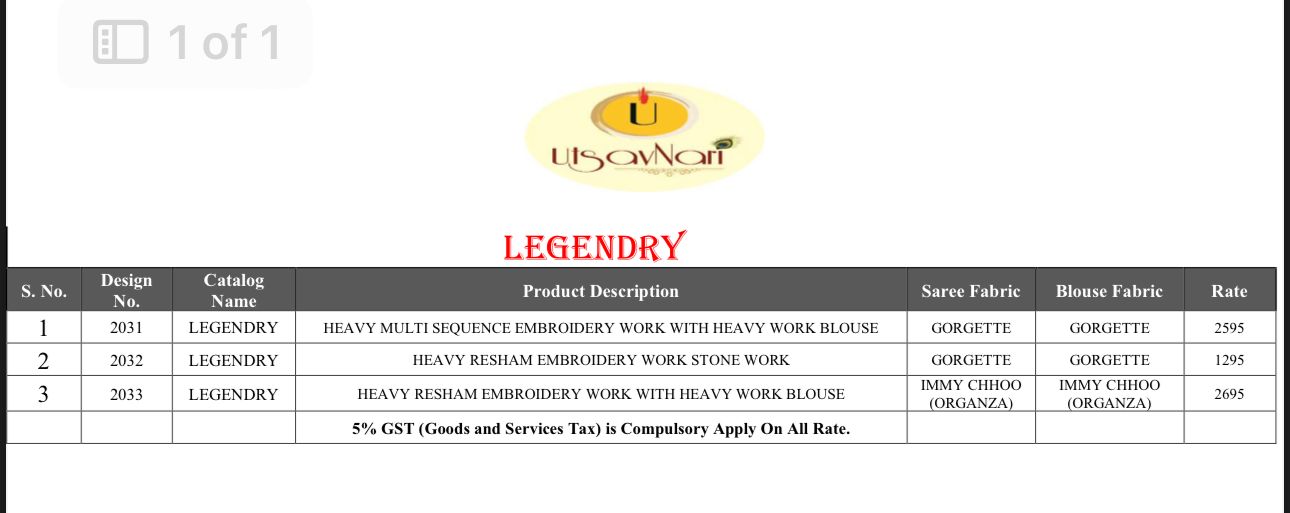 Buy Online Legendry Utsav Nari Georgette Saree Collection 3 Pcs of Full Catalogue at Wholesale Price. Looking for Legendry Utsav Nari Georgette Saree Collection Full Catalouge at Best Price? Buy Now Legendry Utsav Nari Georgette Saree Collection at Wholesale Rate of Rs 0 with Total 3 Pcs from authroized dealer and supplier of Nari Fashion Brand. Cost of Each piece is just only Rs 0 which is very low and affordable price to resale the product in your retail store ,This is Surat based Wholesale Supplier & Dealer of Nari Fashion Brand. Click on Brand name to Know more about Nari Fashion Brand's products.Call or Whatsapp on 9898838984 for booking or enquiry