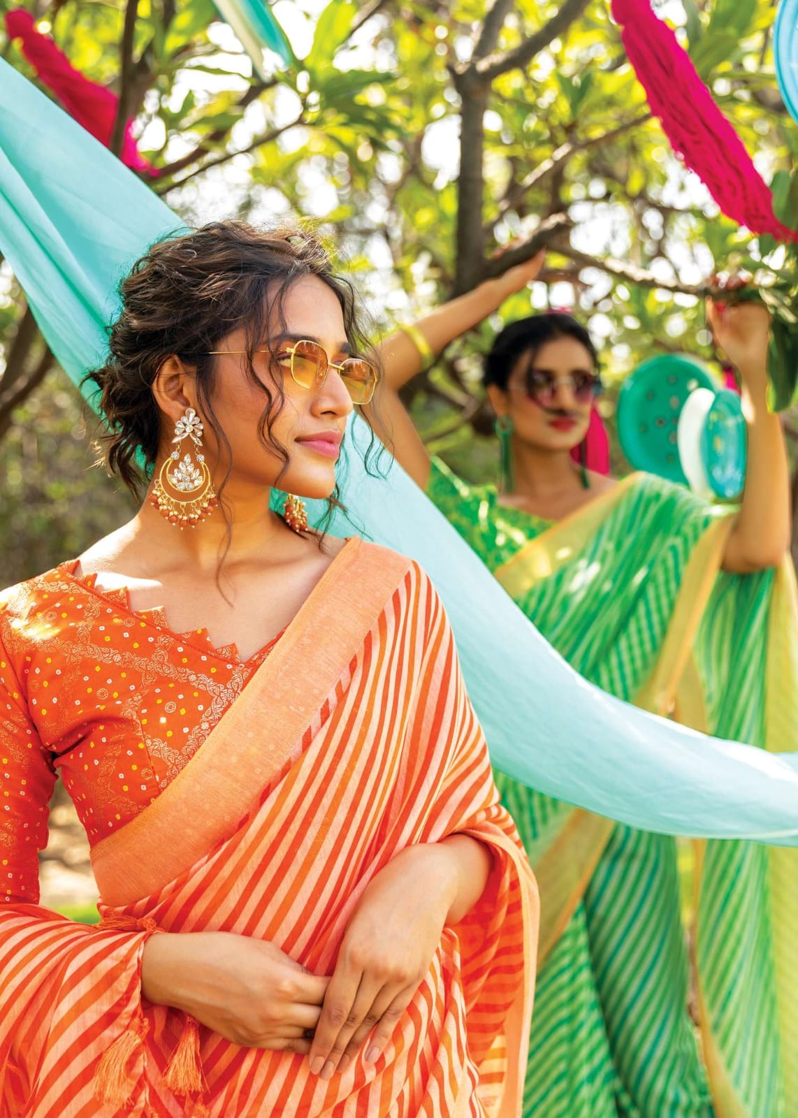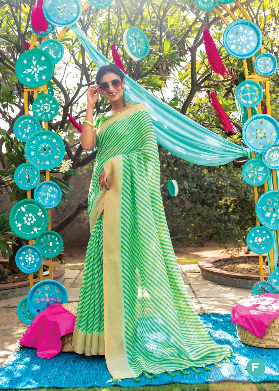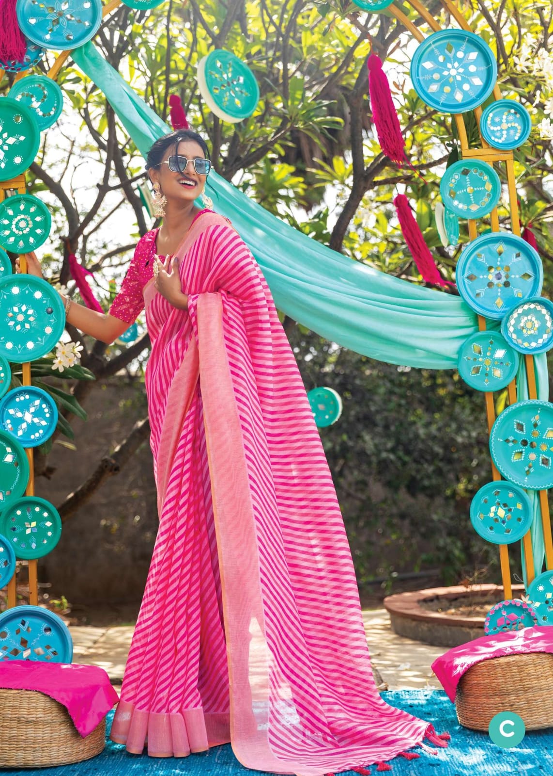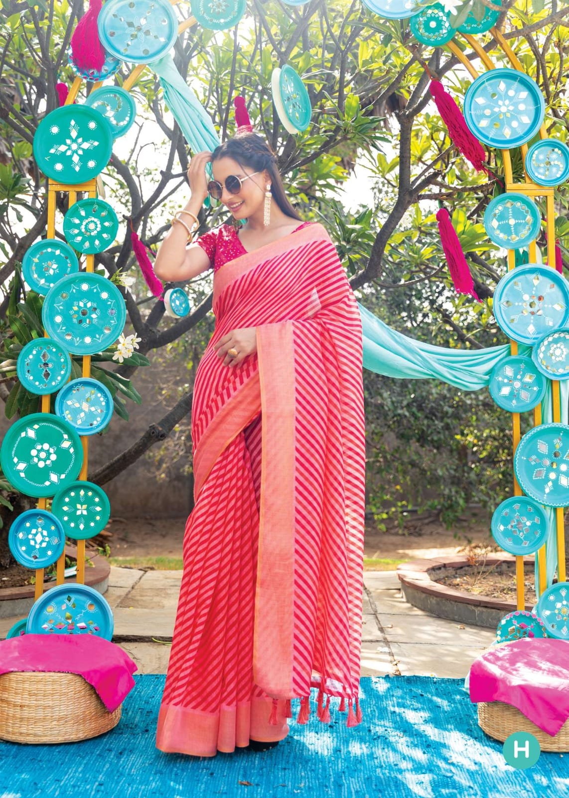 Lehariyaa linen Shangrila super hit lehariyaa saree with bhandej digital foil blouse on cotton zari weaving fabricÂ?!! 8 pc 595/- |