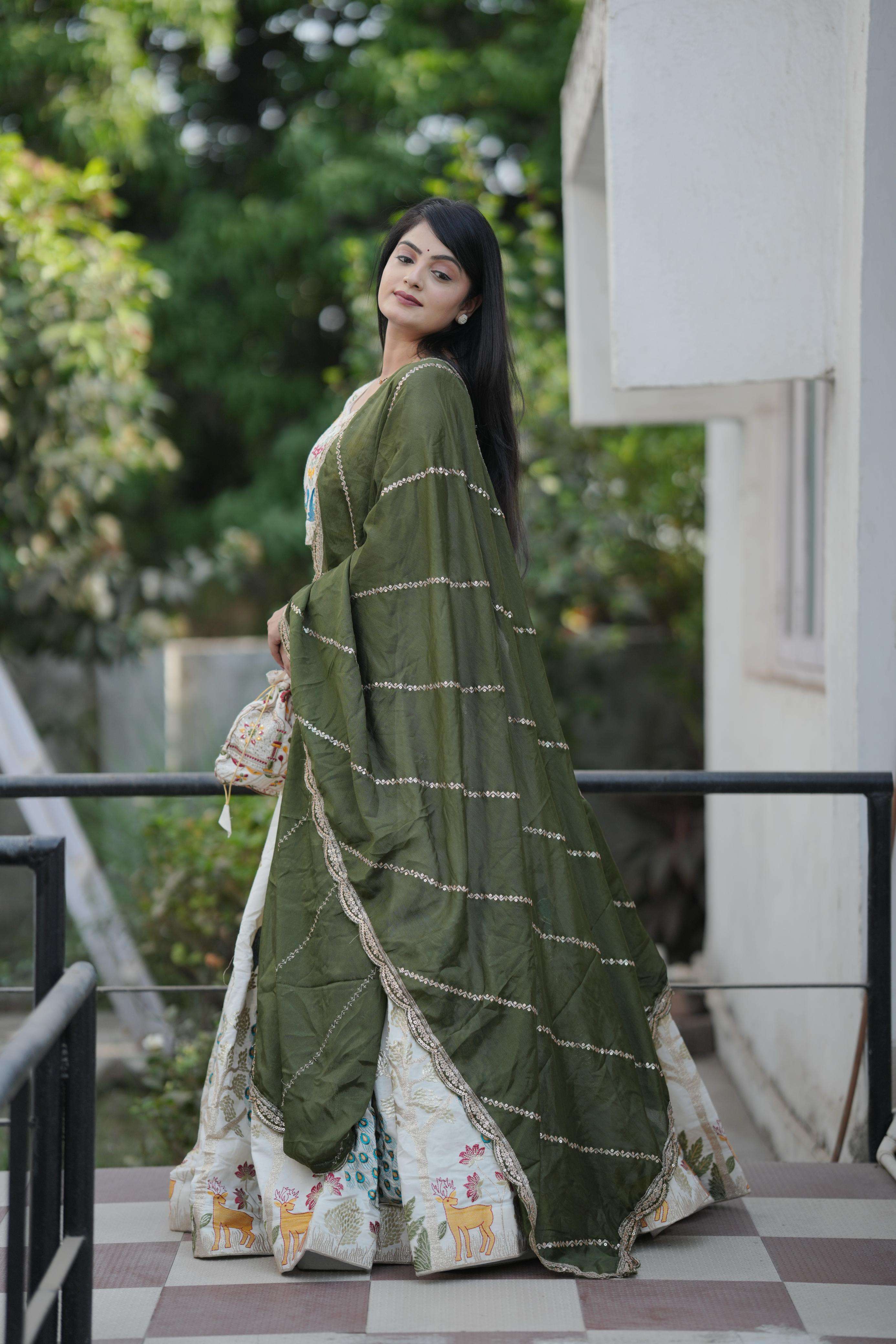 *Dupatta* Dupatta Fabric : Pure Chinon Dupatta Work : Dyed Dupatta With Embroidery and Sequence Matching Cut Work Border Length : 2.35 Meter
