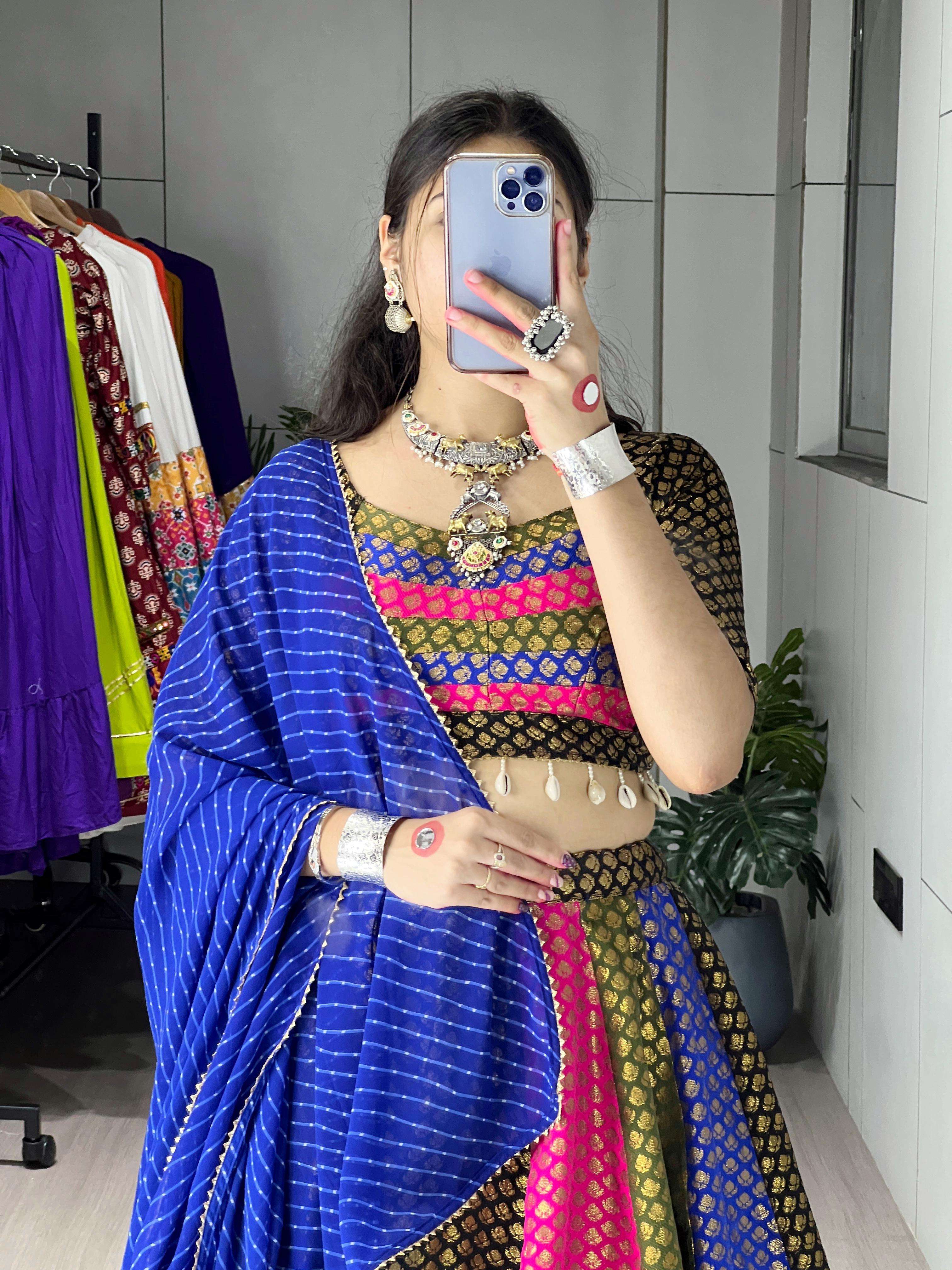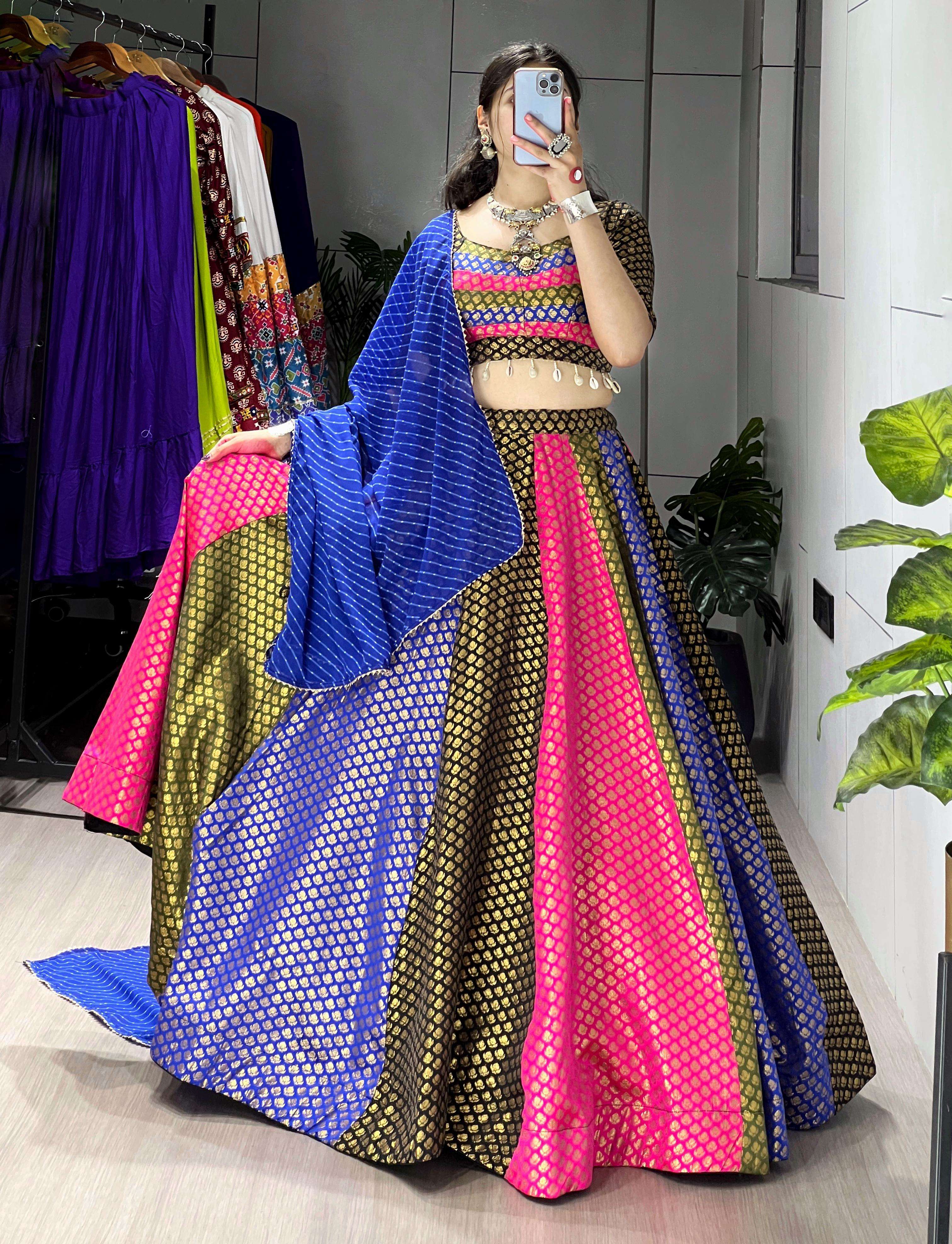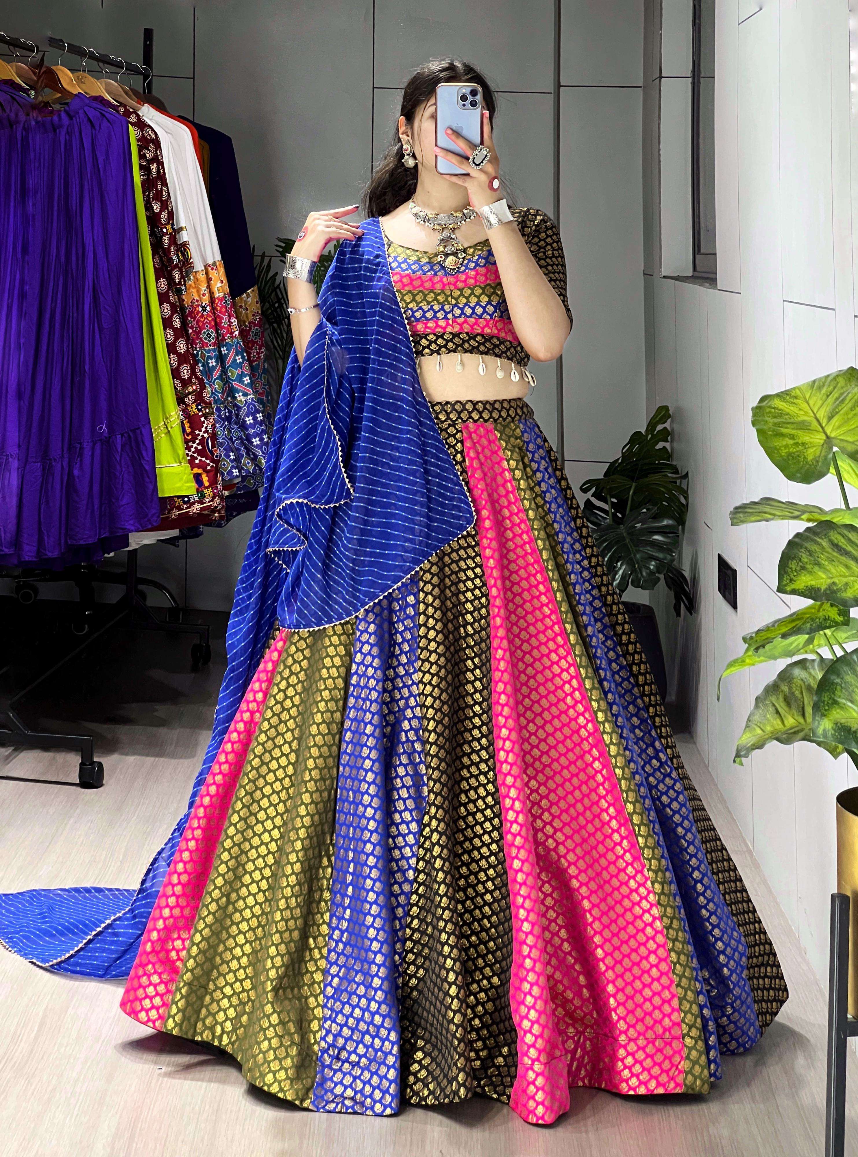 💫 A vibrant multicolor silk lehenga choli that blends tradition with trend. Embrace royalty in this joyful designer outfit, crafted with luxurious tones and elegant finesse. Perfect for Garba, Dandiya & festive nights! 🥰