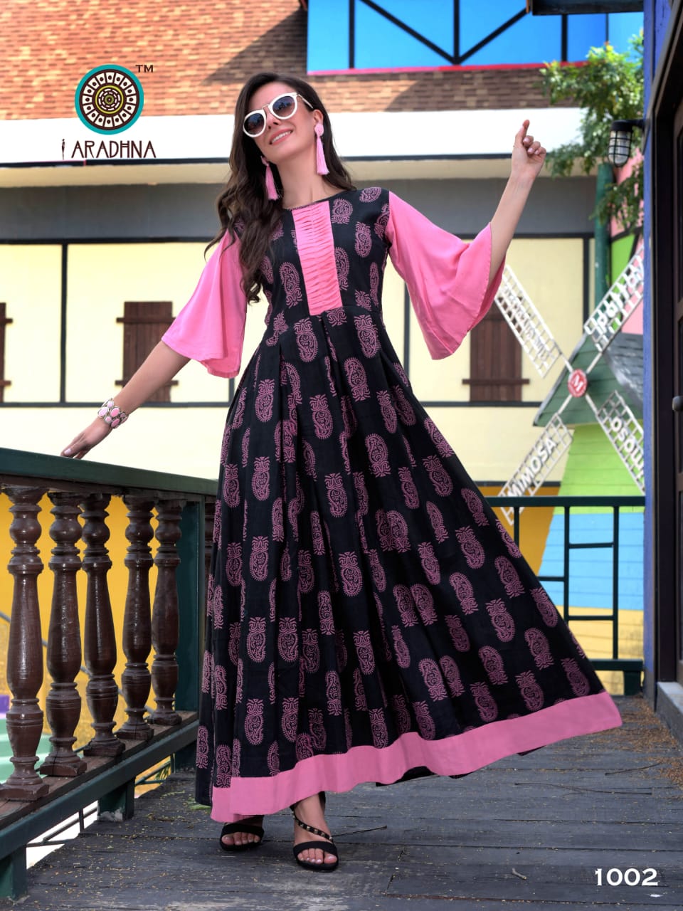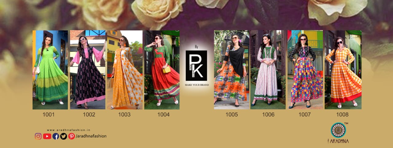 ? *ARADHNA* & *PK* ? Catalog - *Level 1* Brand : ARADHNA Fabric : Heavy Cotton Print and Plain Rayon 14 Kg with flair ?Size : M(38), L(40), XL(42), XXL(44), *3XL(46)* ?Designs : 8 ?Length : 52" to 54" ?Rate : *465 Rs* + 5% GST -: Thanks : - ?? *ARADHNA* ?? |