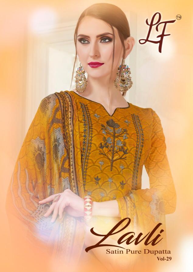 LF vo 29 by Lovely Top Cotton satin print with work cut 2.50 Bottom cotton Cut 2.80 Dupta pure chifon print Rate 799 per Pcs . Set To Set. GST 5 Percent Extra. Delivery 2-3 days |