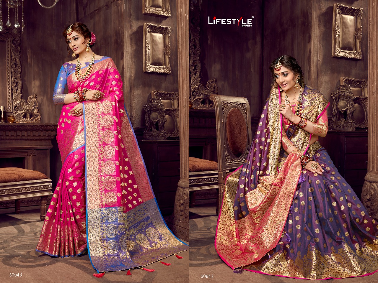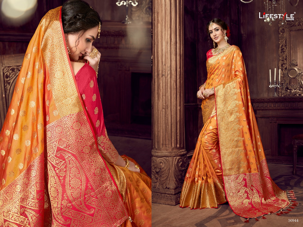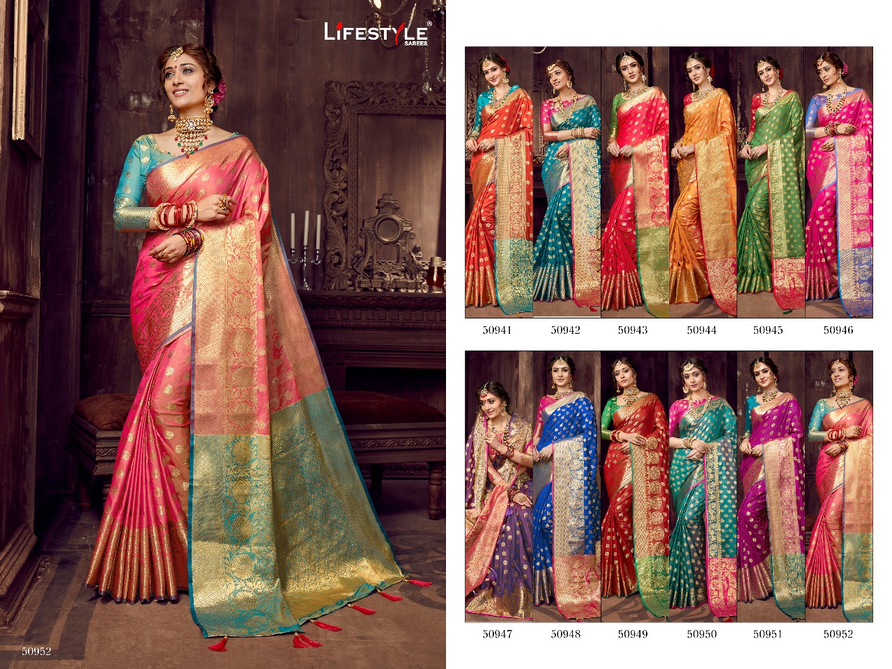 Buy Online Lifestyle Banarasi Silk 50941 Series Party Wear Saree Dealer 12 Pcs of Full Catalogue at Wholesale Price. Looking for Lifestyle Banarasi Silk 50941 Series Party Wear Saree Dealer Full Catalouge at Best Price? Buy Now Lifestyle Banarasi Silk 50941 Series Party Wear Saree Dealer at Wholesale Rate of Rs 12600 with Total 12 Pcs from authroized dealer and supplier of LIFESTYLE Brand. Cost of Each piece is just only Rs 1050 which is very low and affordable price to resale the product in your retail store ,This is Surat based Wholesale Supplier & Dealer of LIFESTYLE Brand. Click on Brand name to Know more about LIFESTYLE Brand's products.Call or Whatsapp on 9898838984 for booking or enquiry