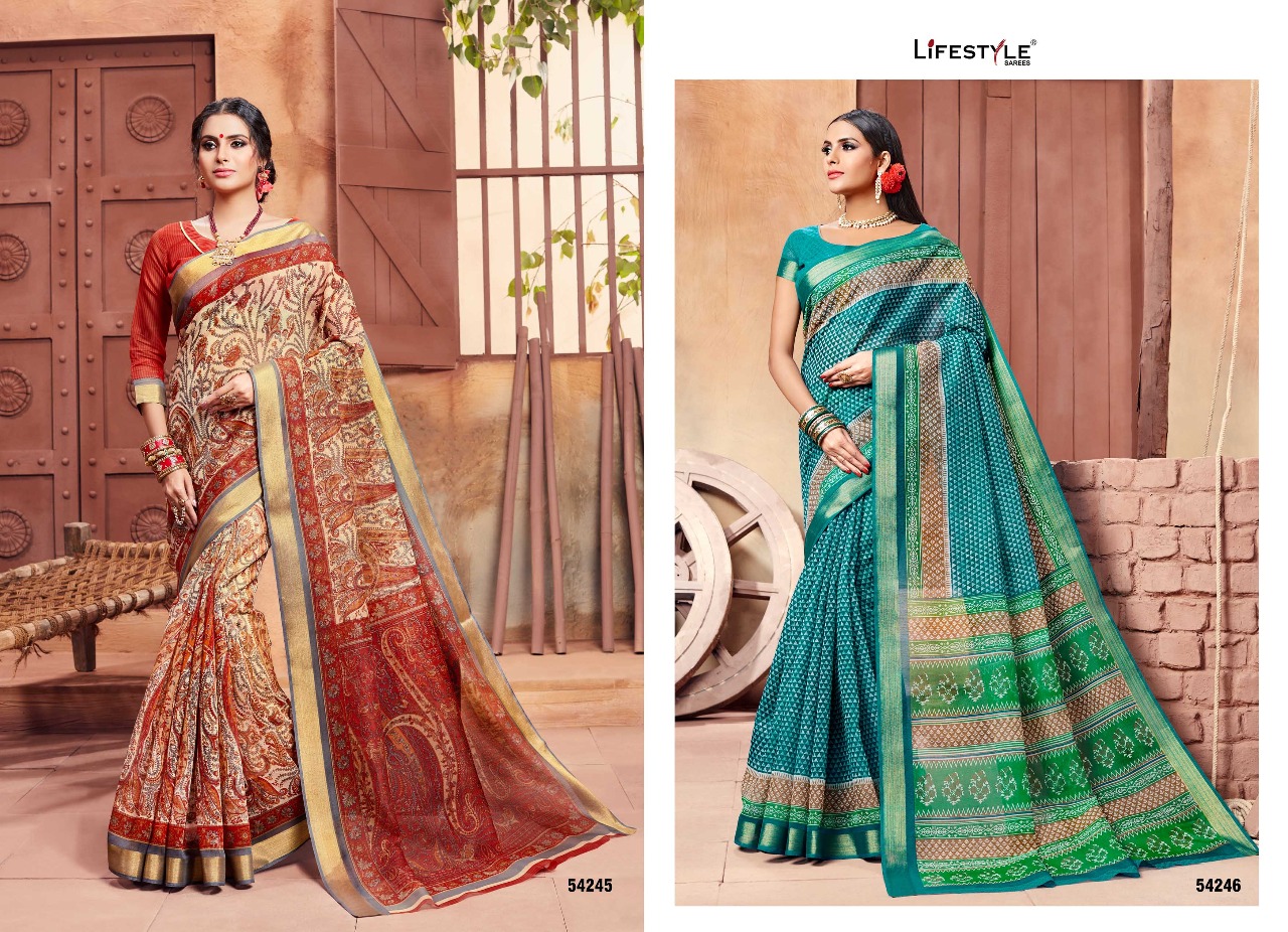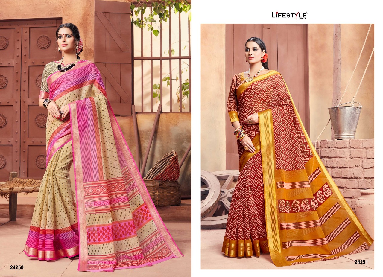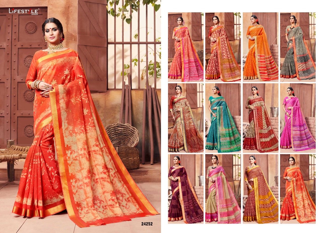Buy Online Lifestyle Jari Cotton Vol 7 54241 Series Cotton Printed Saree Catlog Wholesale Dealer Surat 12 Pcs of Full Catalogue at Wholesale Price. Looking for Lifestyle Jari Cotton Vol 7 54241 Series Cotton Printed Saree Catlog Wholesale Dealer Surat Full Catalouge at Best Price? Buy Now Lifestyle Jari Cotton Vol 7 54241 Series Cotton Printed Saree Catlog Wholesale Dealer Surat at Wholesale Rate of Rs 6960 with Total 12 Pcs from authroized dealer and supplier of LIFESTYLE Brand. Cost of Each piece is just only Rs 580 which is very low and affordable price to resale the product in your retail store ,This is Surat based Wholesale Supplier & Dealer of LIFESTYLE Brand. Click on Brand name to Know more about LIFESTYLE Brand's products.Call or Whatsapp on 9898838984 for booking or enquiry