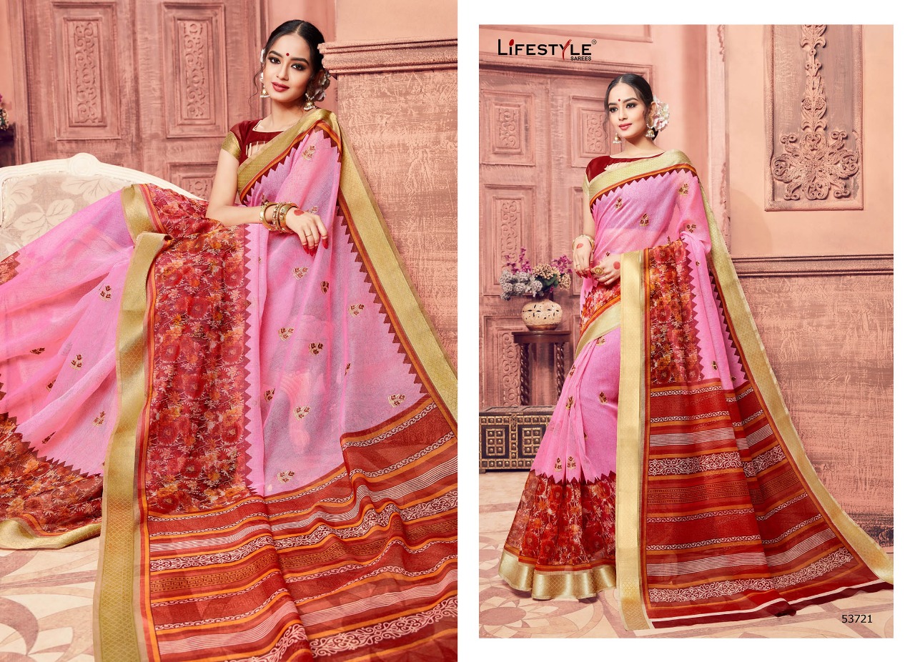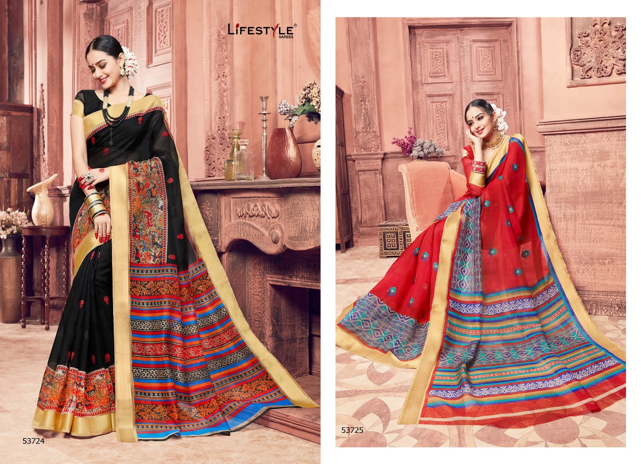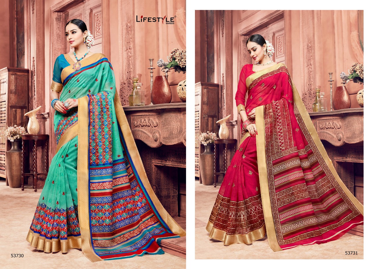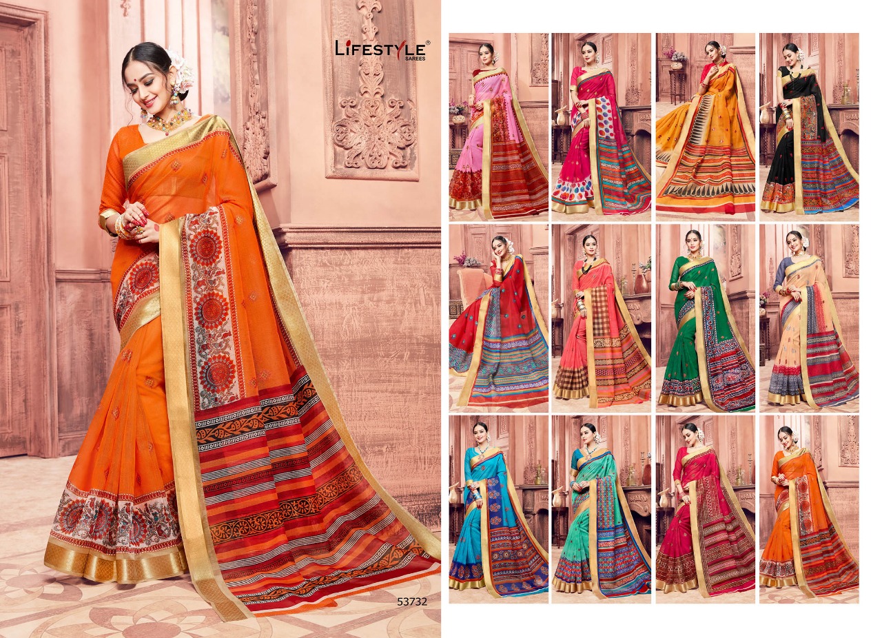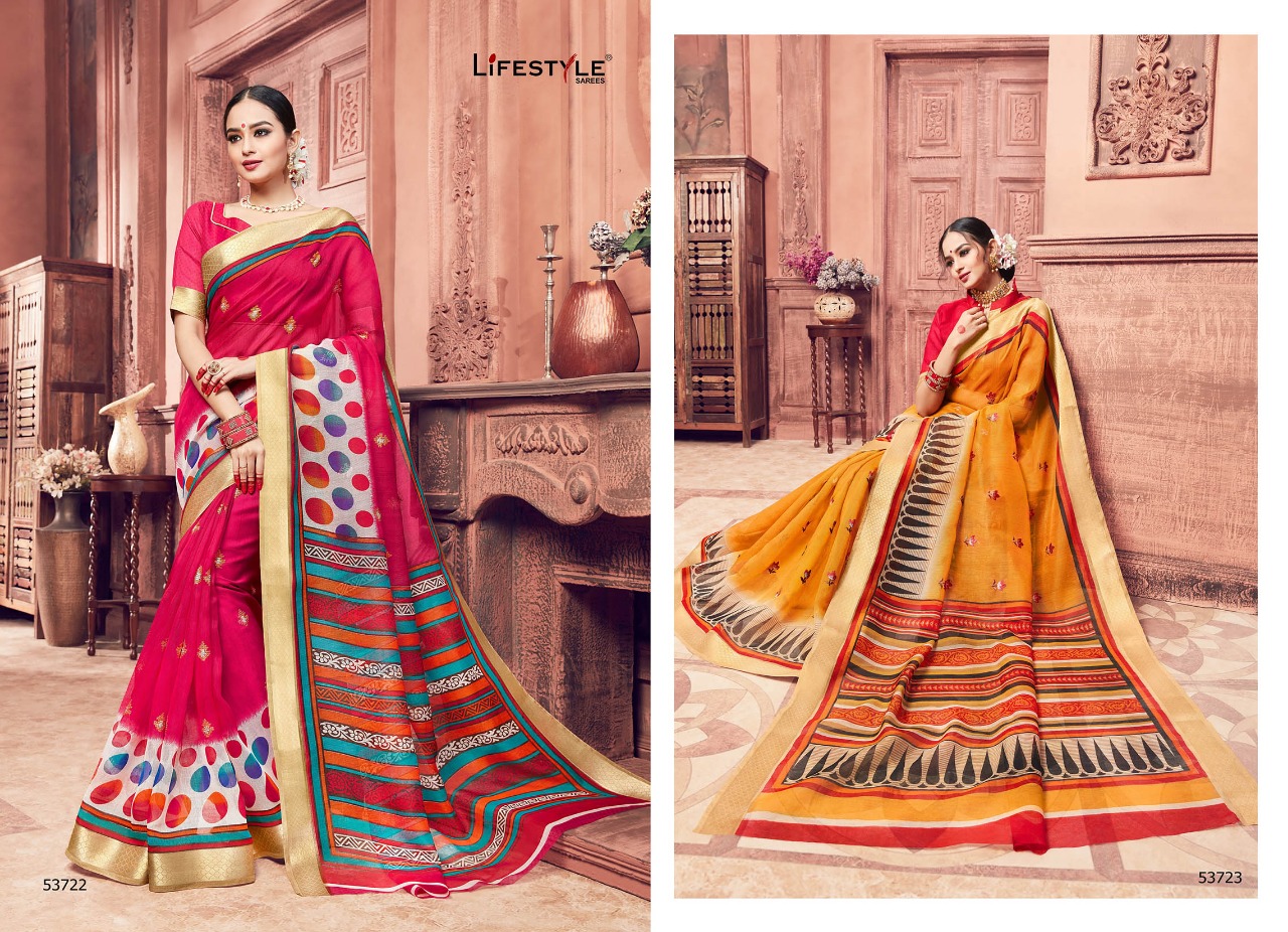 Buy Online Lifestyle Kashida Cotton 53721 Series Cotton Print Work Sari 12 Pcs of Full Catalogue at Wholesale Price. Looking for Lifestyle Kashida Cotton 53721 Series Cotton Print Work Sari Full Catalouge at Best Price? Buy Now Lifestyle Kashida Cotton 53721 Series Cotton Print Work Sari at Wholesale Rate of Rs 10092 with Total 12 Pcs from authroized dealer and supplier of LIFESTYLE Brand. Cost of Each piece is just only Rs 841 which is very low and affordable price to resale the product in your retail store ,This is Surat based Wholesale Supplier & Dealer of LIFESTYLE Brand. Click on Brand name to Know more about LIFESTYLE Brand's products.Call or Whatsapp on 9898838984 for booking or enquiry