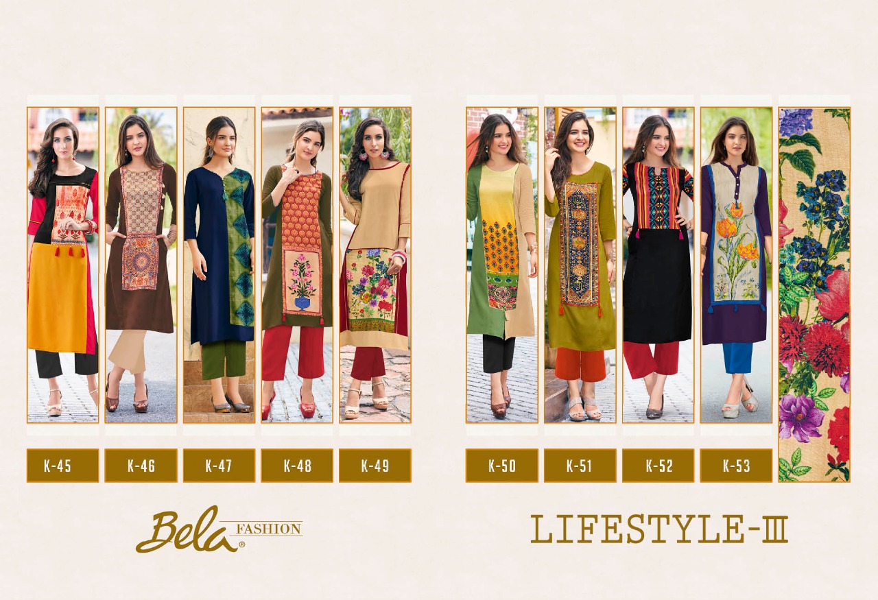 Lifestyle Vol 3 By Bela Fashion Reyon Printed Desinger Kurtis Wholesale Supplier And Dealer Surat