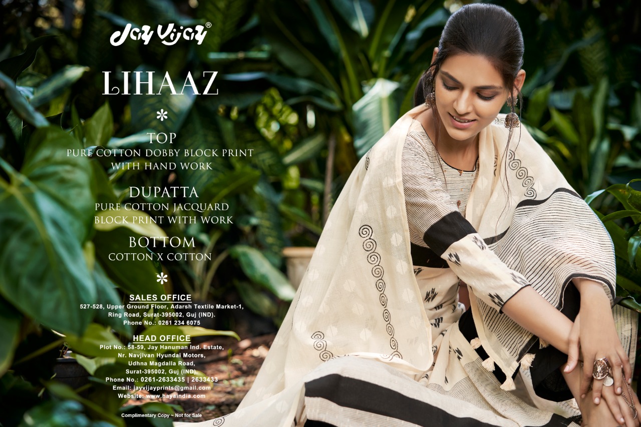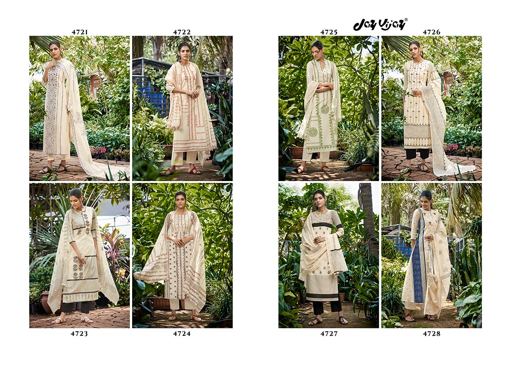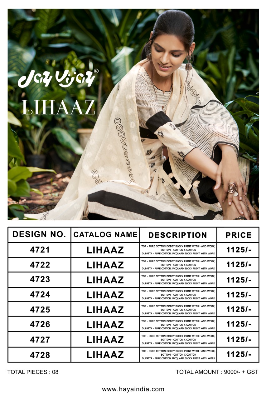 Buy Online Lihaaz By Jay Vijay Series 4721 To 4728 Cotton Designer Party Wear Suits Wholesale Supplier Gujarat 8 Pcs of Full Catalogue at Wholesale Price. Looking for Lihaaz By Jay Vijay Series 4721 To 4728 Cotton Designer Party Wear Suits Wholesale Supplier Gujarat Full Catalouge at Best Price? Buy Now Lihaaz By Jay Vijay Series 4721 To 4728 Cotton Designer Party Wear Suits Wholesale Supplier Gujarat at Wholesale Rate of Rs 9000 with Total 8 Pcs from authroized dealer and supplier of JAY VIJAY Brand. Cost of Each piece is just only Rs 1125 which is very low and affordable price to resale the product in your retail store ,This is Surat based Wholesale Supplier & Dealer of JAY VIJAY Brand. Click on Brand name to Know more about JAY VIJAY Brand's products.Call or Whatsapp on 9898838984 for booking or enquiry