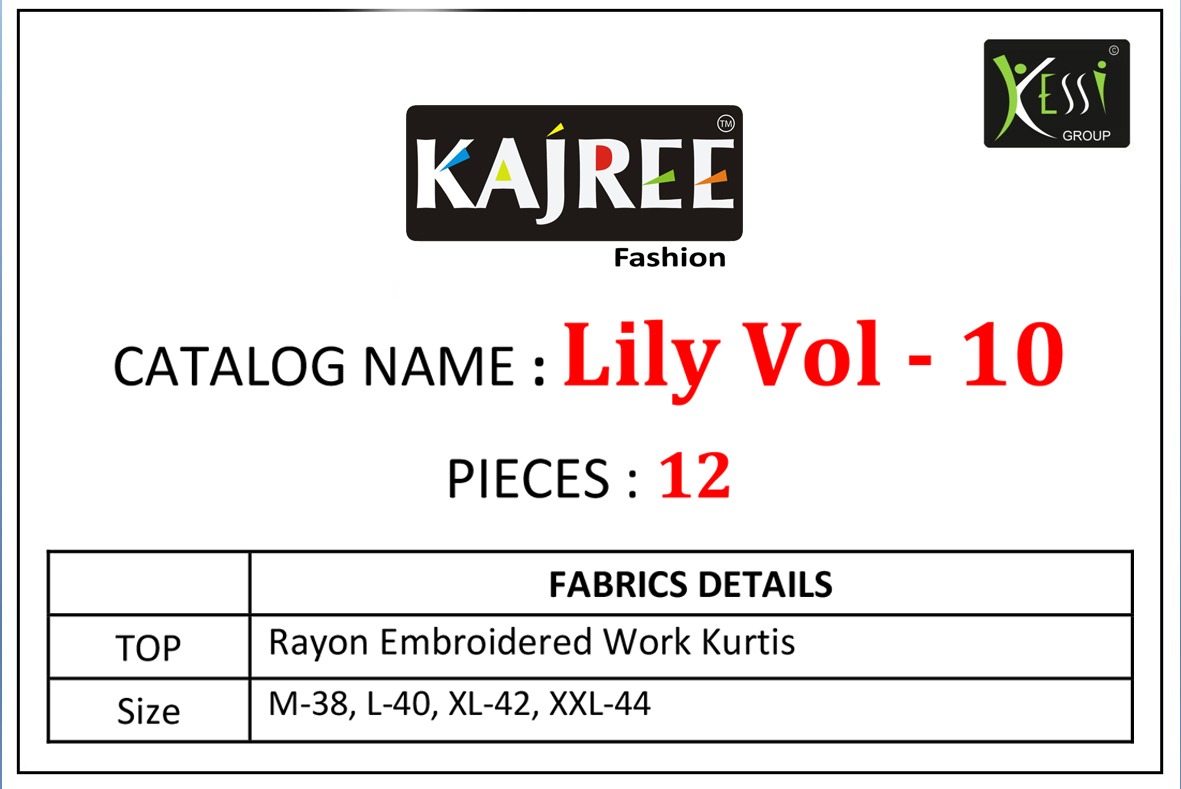 Buy Online Lily Vol 10 By Kajree Fashion Reyon Embroidered Kurtis Wholesale Supplier And Dealer Gujarat 12 Pcs of Full Catalogue at Wholesale Price. Looking for Lily Vol 10 By Kajree Fashion Reyon Embroidered Kurtis Wholesale Supplier And Dealer Gujarat Full Catalouge at Best Price? Buy Now Lily Vol 10 By Kajree Fashion Reyon Embroidered Kurtis Wholesale Supplier And Dealer Gujarat at Wholesale Rate of Rs 4200 with Total 12 Pcs from authroized dealer and supplier of KAJRI STYLE Brand. Cost of Each piece is just only Rs 350 which is very low and affordable price to resale the product in your retail store ,This is Surat based Wholesale Supplier & Dealer of KAJRI STYLE Brand. Click on Brand name to Know more about KAJRI STYLE Brand's products.Call or Whatsapp on 9898838984 for booking or enquiry