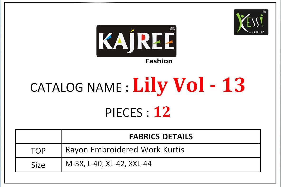 Buy Online Lily Vol 13 By Kajree Reyon Embroidered Designer Kurtis Wholesale Supplier Surat 12 Pcs of Full Catalogue at Wholesale Price. Looking for Lily Vol 13 By Kajree Reyon Embroidered Designer Kurtis Wholesale Supplier Surat Full Catalouge at Best Price? Buy Now Lily Vol 13 By Kajree Reyon Embroidered Designer Kurtis Wholesale Supplier Surat at Wholesale Rate of Rs 4200 with Total 12 Pcs from authroized dealer and supplier of KESSI Brand. Cost of Each piece is just only Rs 350 which is very low and affordable price to resale the product in your retail store ,This is Surat based Wholesale Supplier & Dealer of KESSI Brand. Click on Brand name to Know more about KESSI Brand's products.Call or Whatsapp on 9898838984 for booking or enquiry