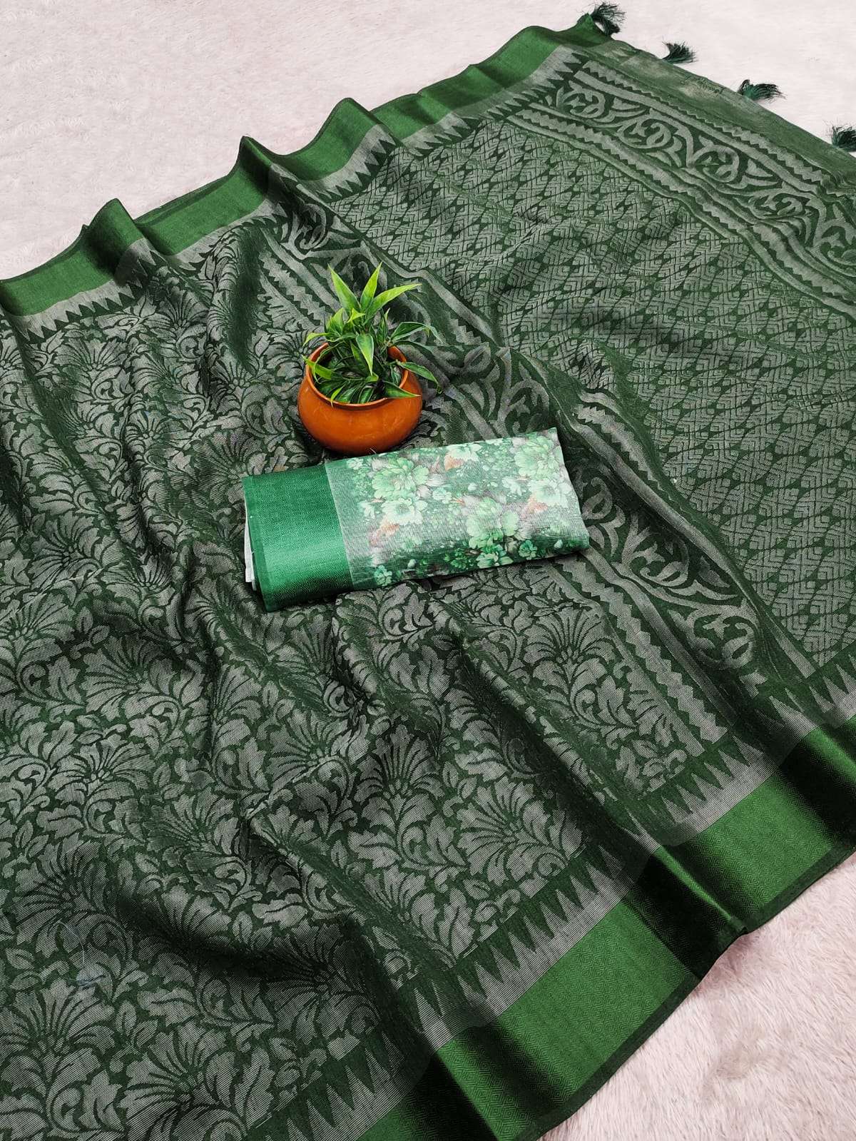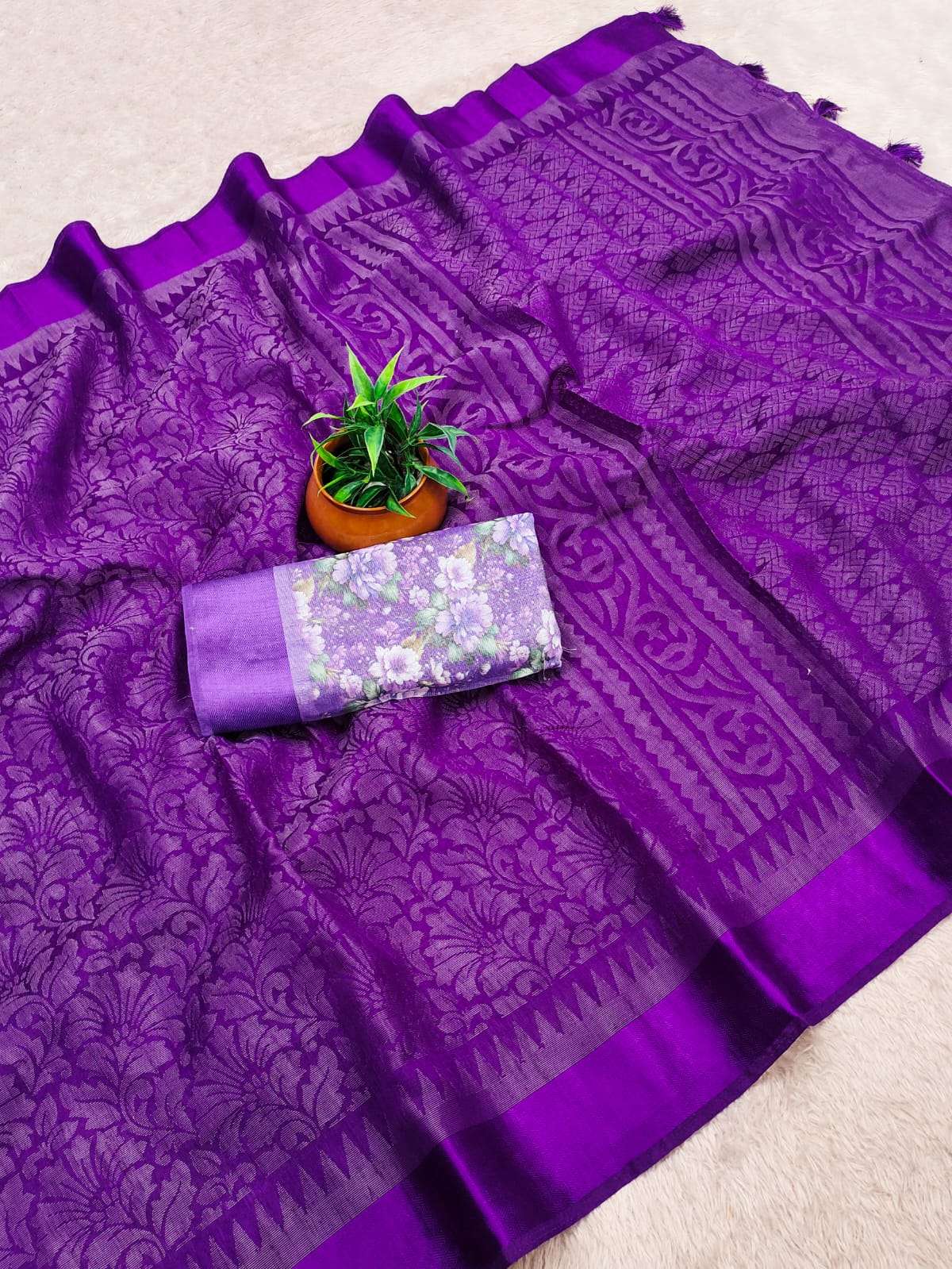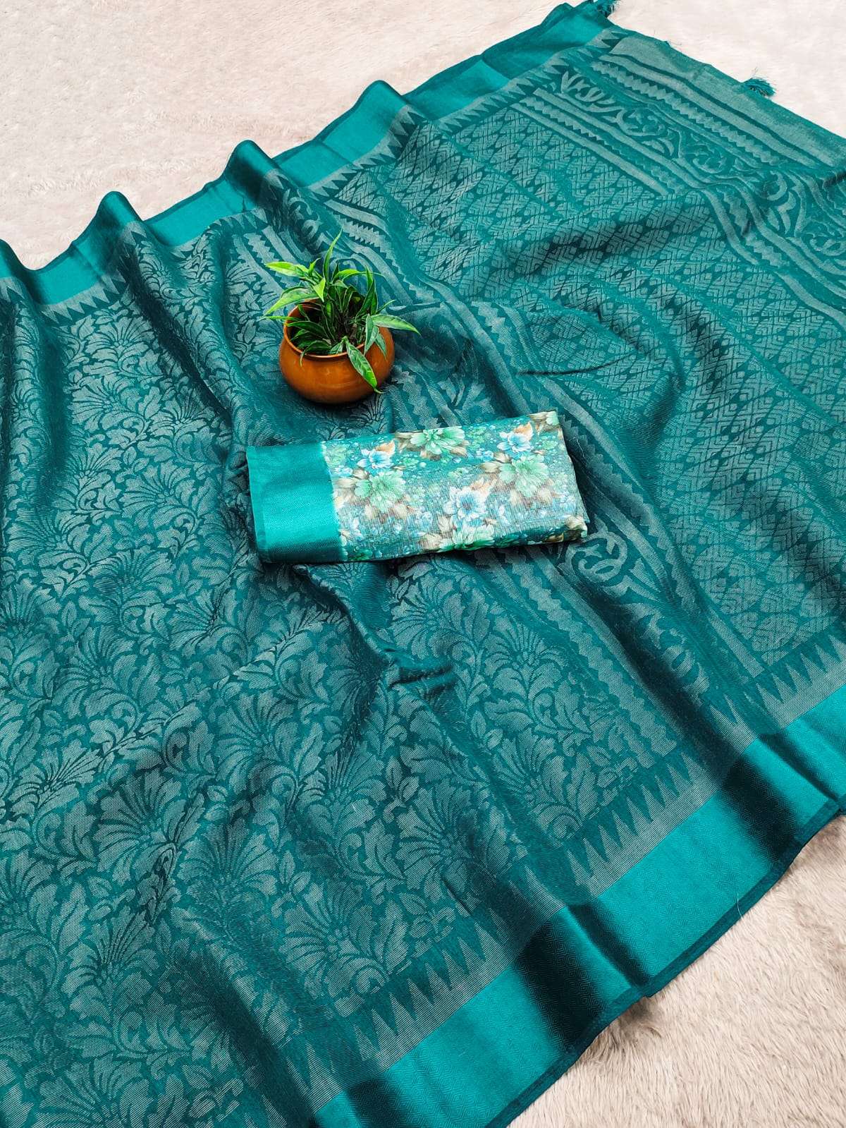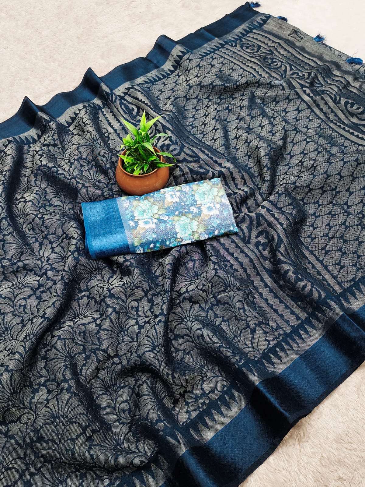 Presenting the stunning Linen Jute Brasso Collection, designed to offer a unique blend of elegance and modern style. Crafted from premium linen jute fabric, this saree features all-over beautiful Brasso weaving, giving it a rich textured look and graceful appeal. The saree is enhanced with a satin-based border that adds a smooth and stylish contrast to the fabric. It also comes with a heavy Brasso weaved blouse piece, perfectly complementing the saree’s elegant design. The grand rich pallu completes the look, making it ideal for festive occasions, parties, and special gatherings. Product Highlights: