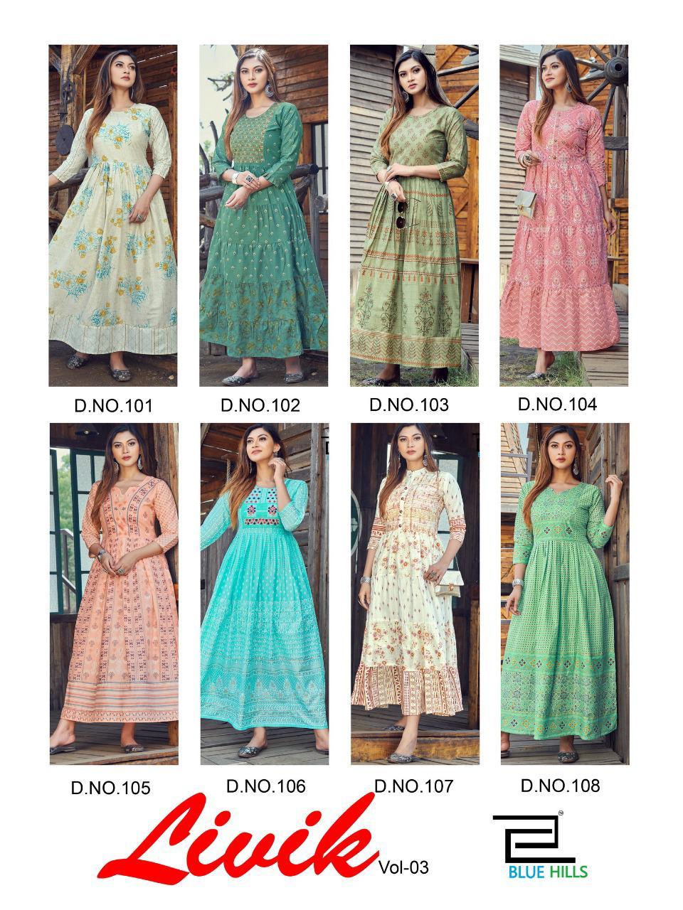 Buy Online Livik Vol 3 By Blue Hills Heavy Cotton Gown Kurti Wholesale Supplier Traders In Surat 8 Pcs of Full Catalogue at Wholesale Price. Looking for Livik Vol 3 By Blue Hills Heavy Cotton Gown Kurti Wholesale Supplier Traders In Surat Full Catalouge at Best Price? Buy Now Livik Vol 3 By Blue Hills Heavy Cotton Gown Kurti Wholesale Supplier Traders In Surat at Wholesale Rate of Rs 5520 with Total 8 Pcs from authroized dealer and supplier of Blue hills Brand. Cost of Each piece is just only Rs 690 which is very low and affordable price to resale the product in your retail store ,This is Surat based Wholesale Supplier & Dealer of Blue hills Brand. Click on Brand name to Know more about Blue hills Brand's products.Call or Whatsapp on 9898838984 for booking or enquiry