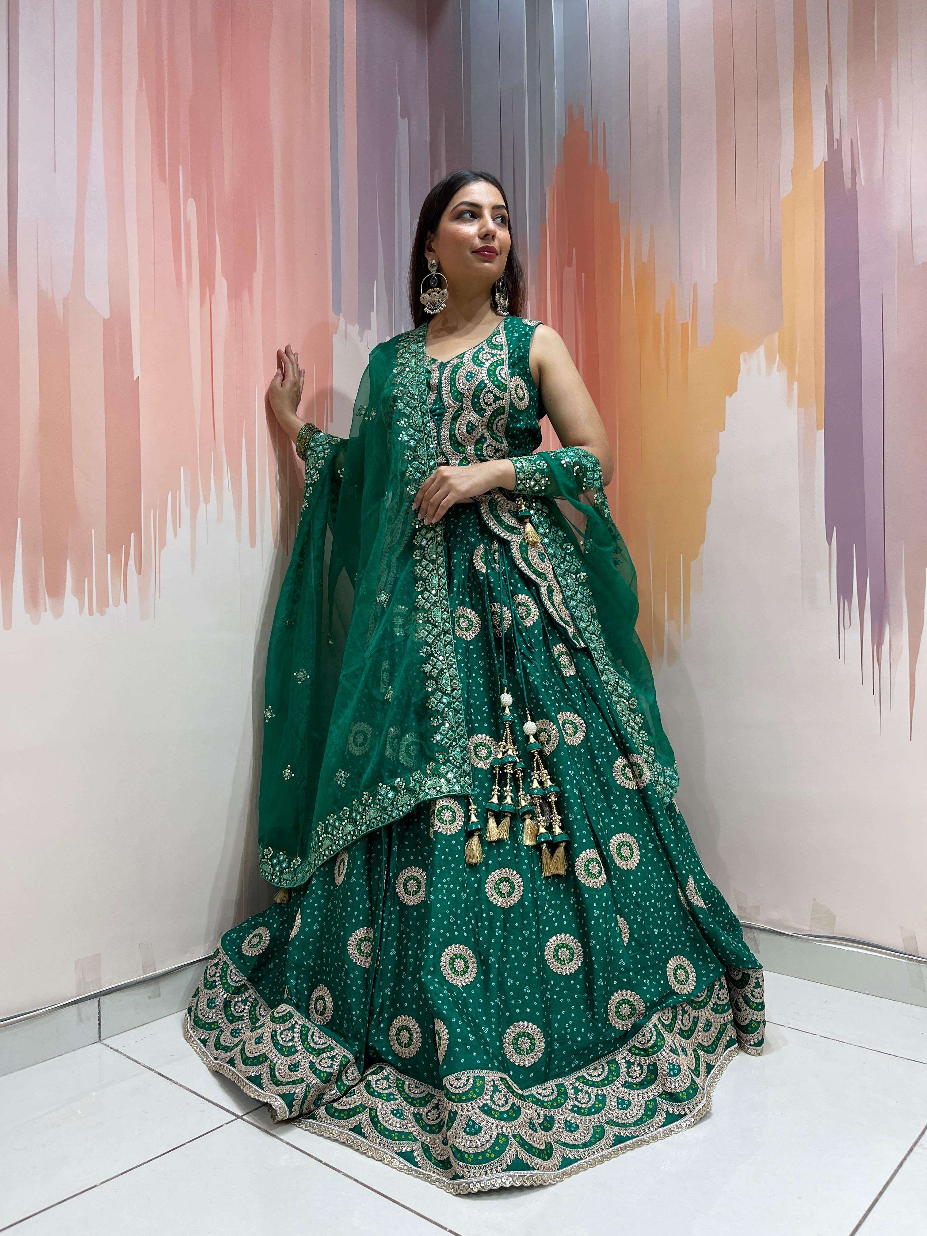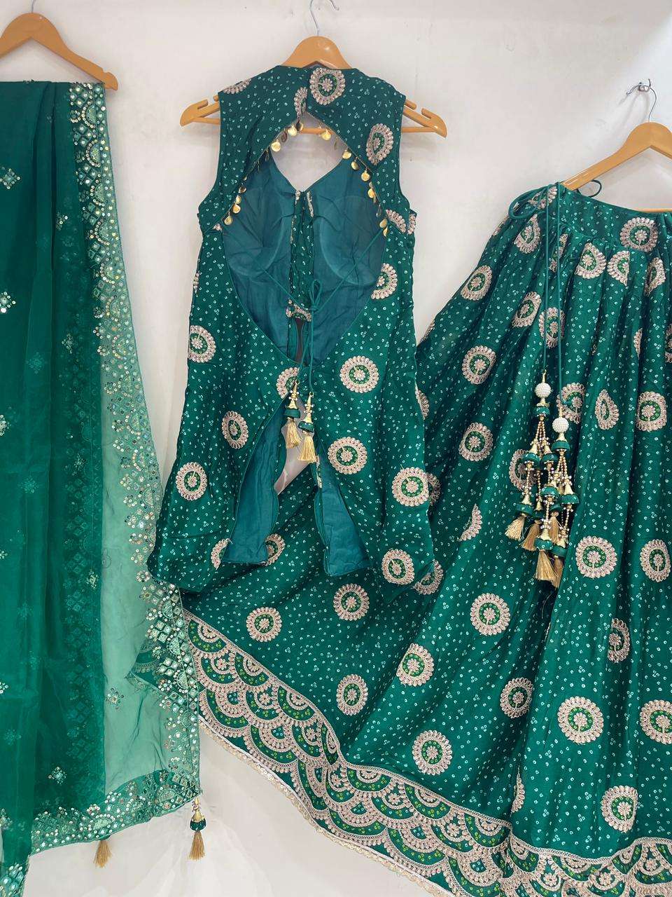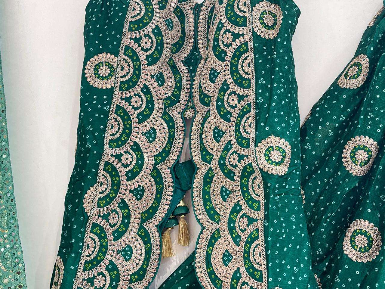 *Skirt/bottom*: *DOLA Silk bandhej Butta printed Ethnic Royal look embroidered Chaniya big 6 Mtrs flair big sequence border with big size classic nice heavy quality latkan*