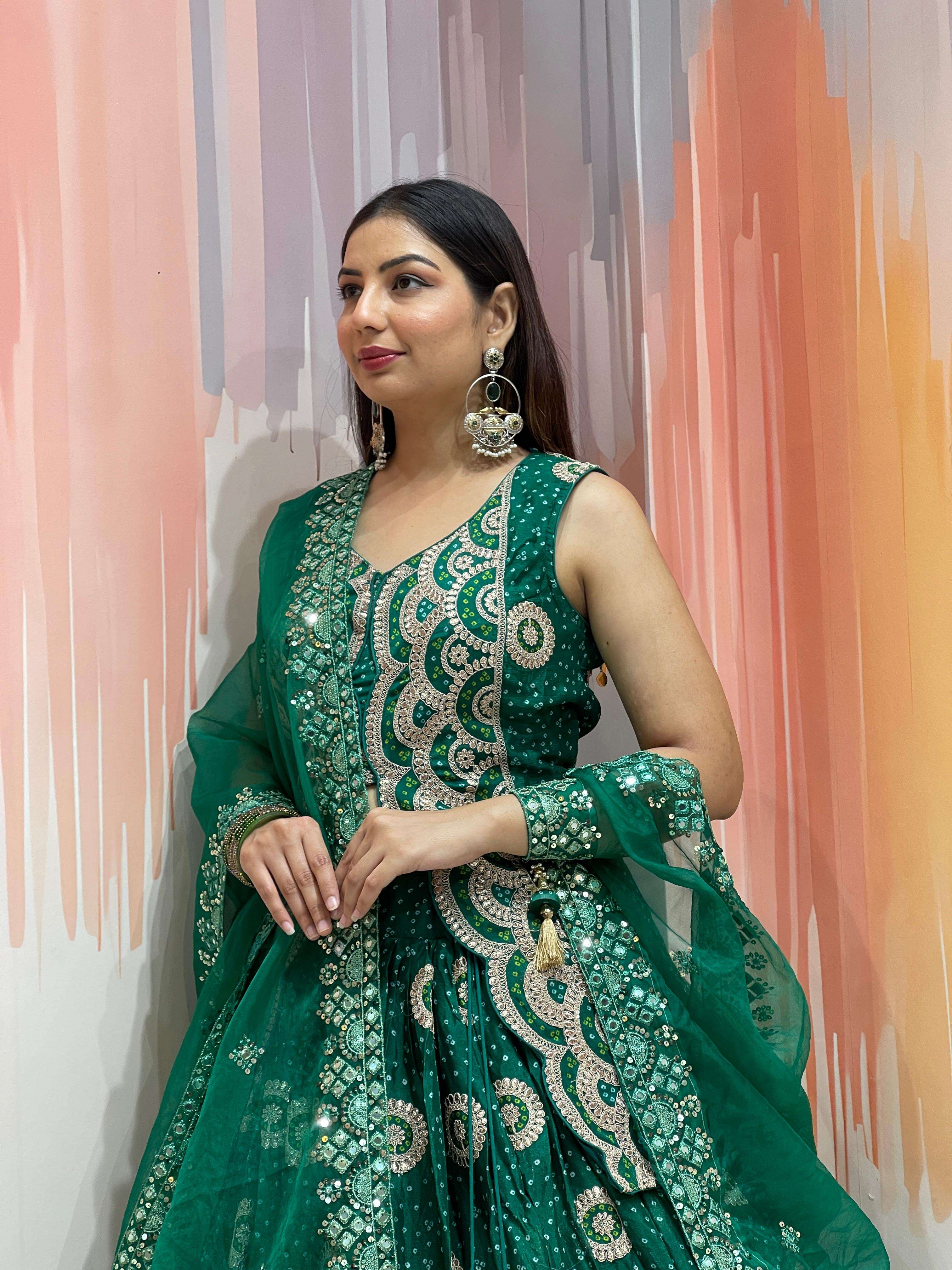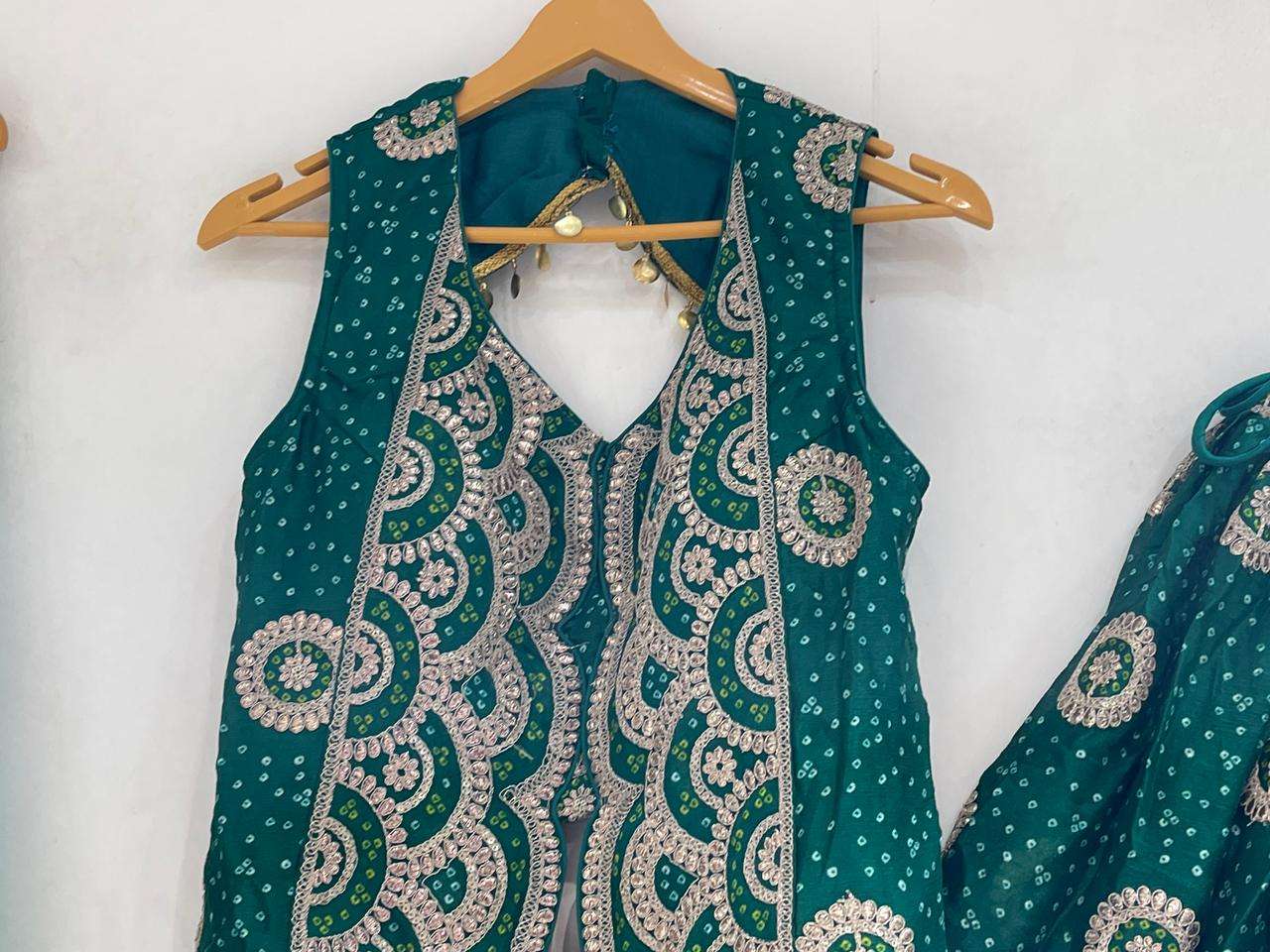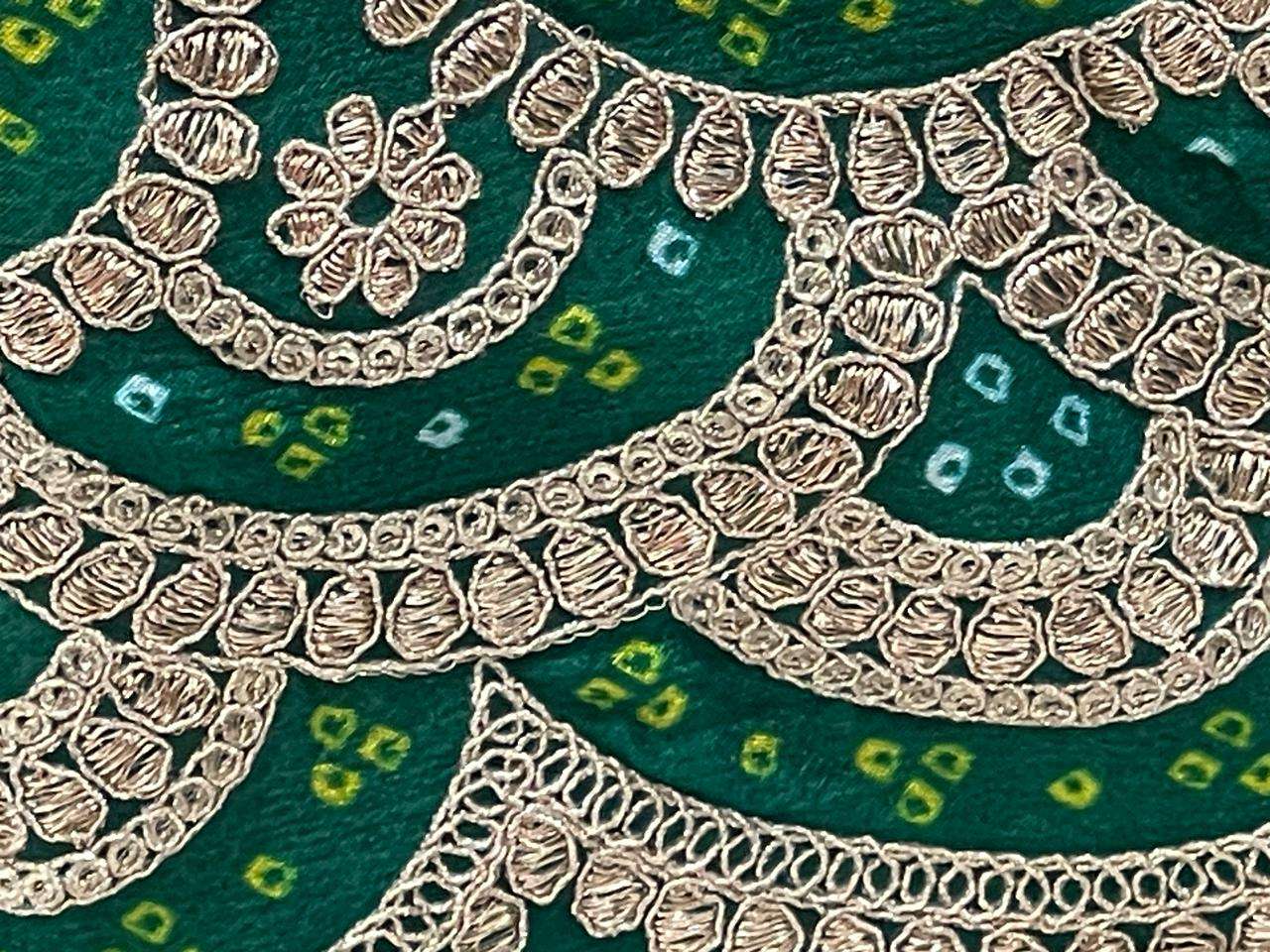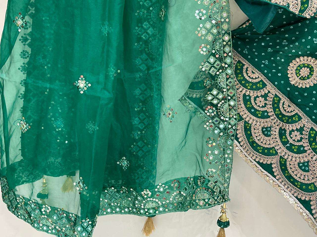 *Skirt/bottom*: *DOLA Silk bandhej Butta printed Ethnic Royal look embroidered Chaniya big 6 Mtrs flair big sequence border with big size classic nice heavy quality latkan*