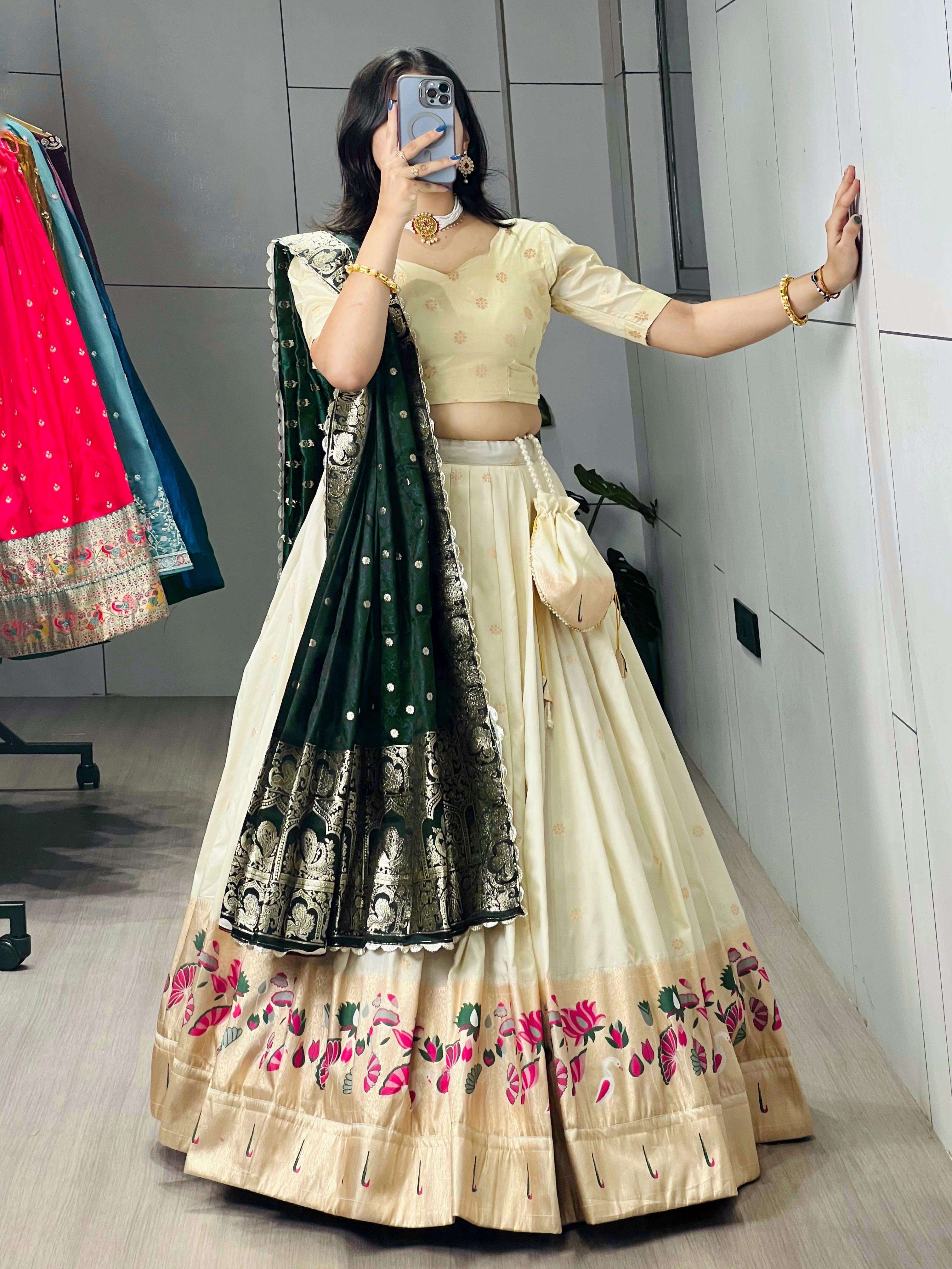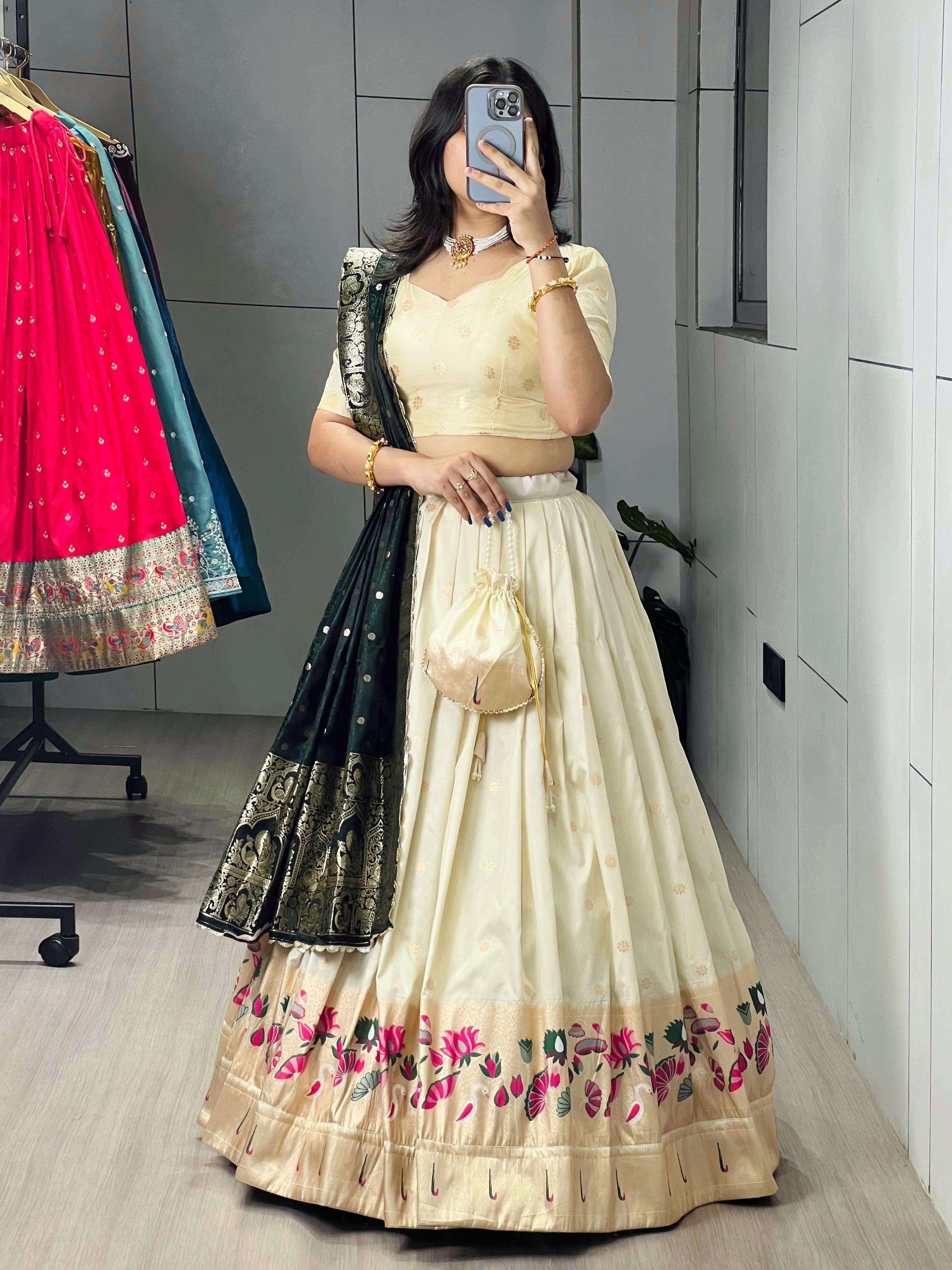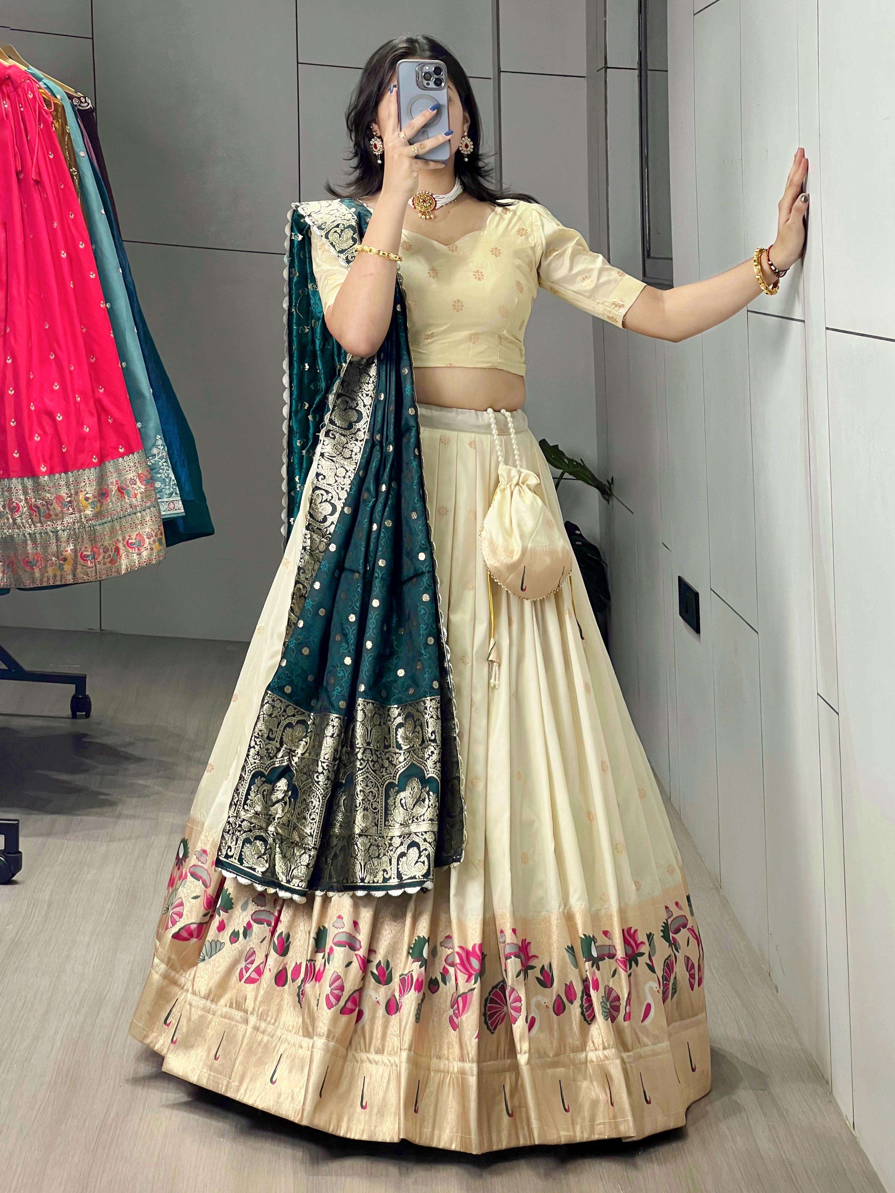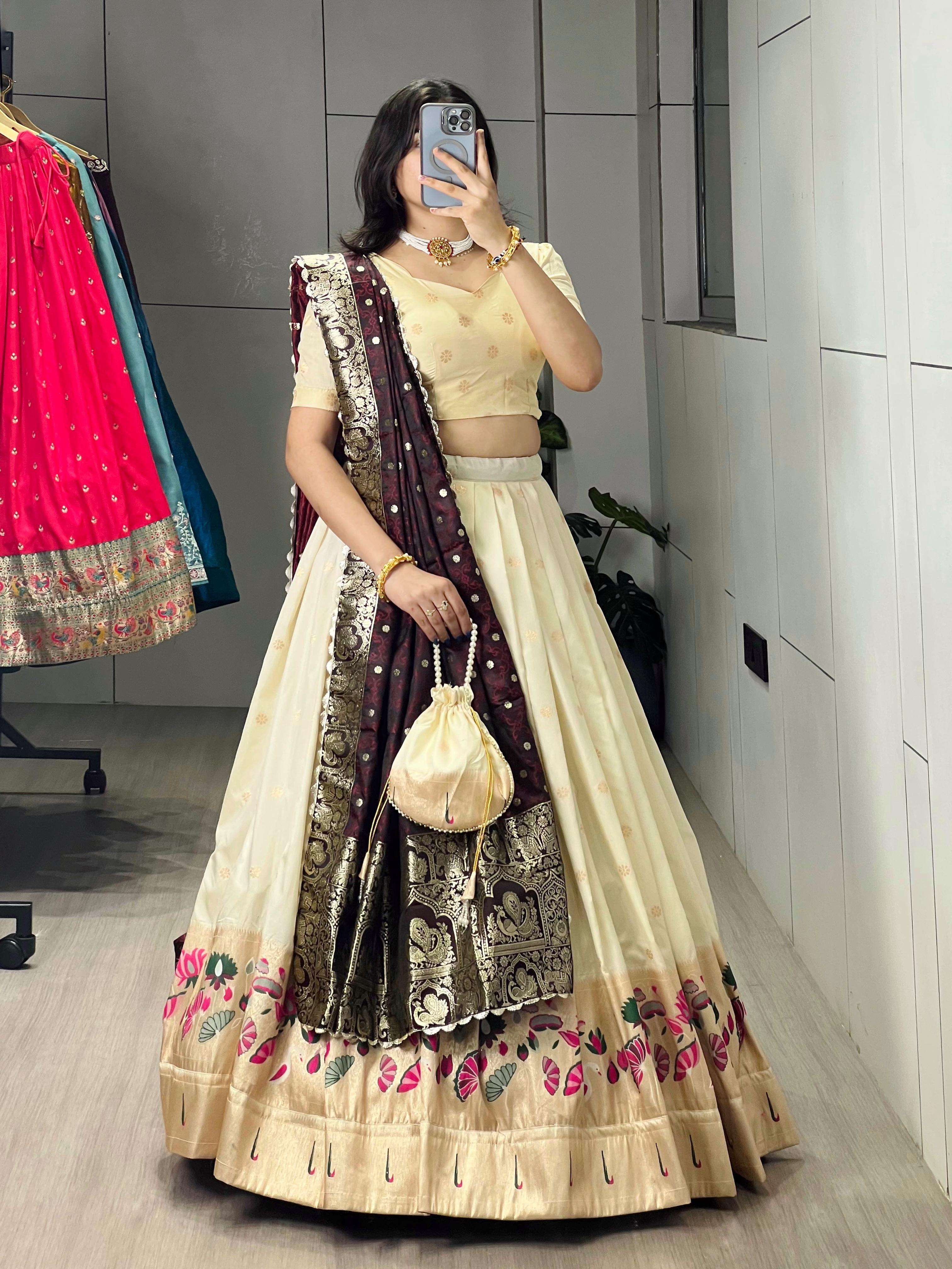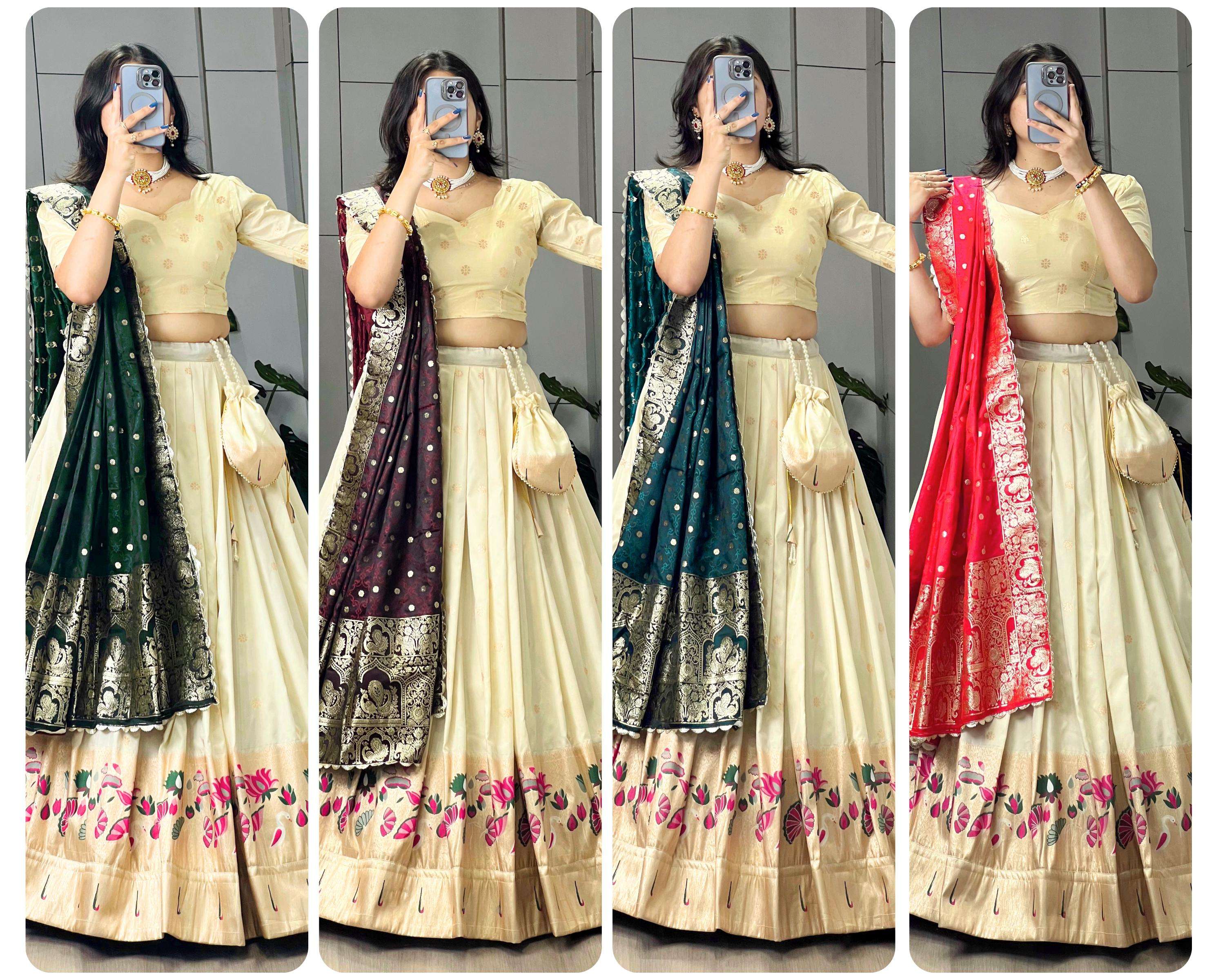 _Presenting the richness of Paithani heritage, this exquisite Paithani silk lehenga features vibrant woven Colorful motifs and an iconic zari border With Iconic Dupatta._👜