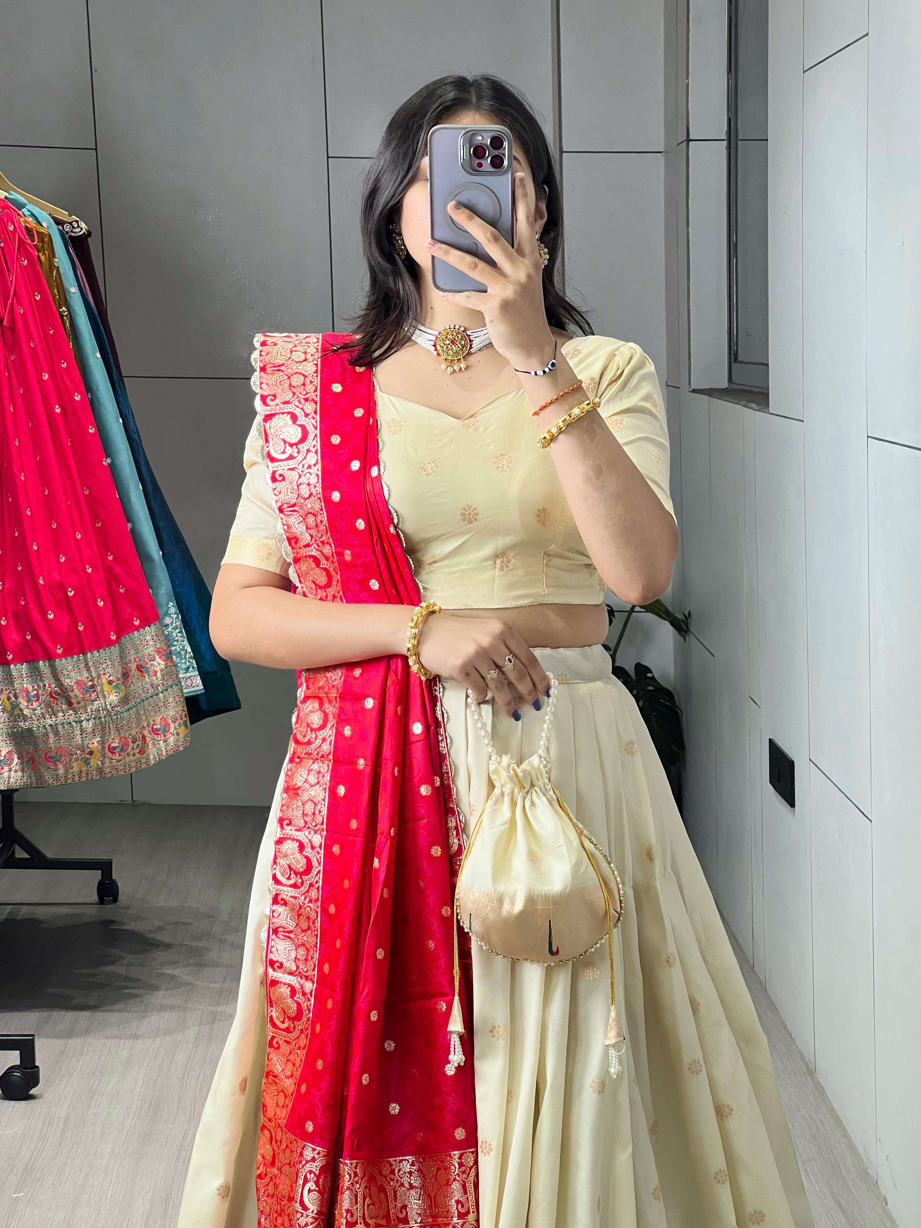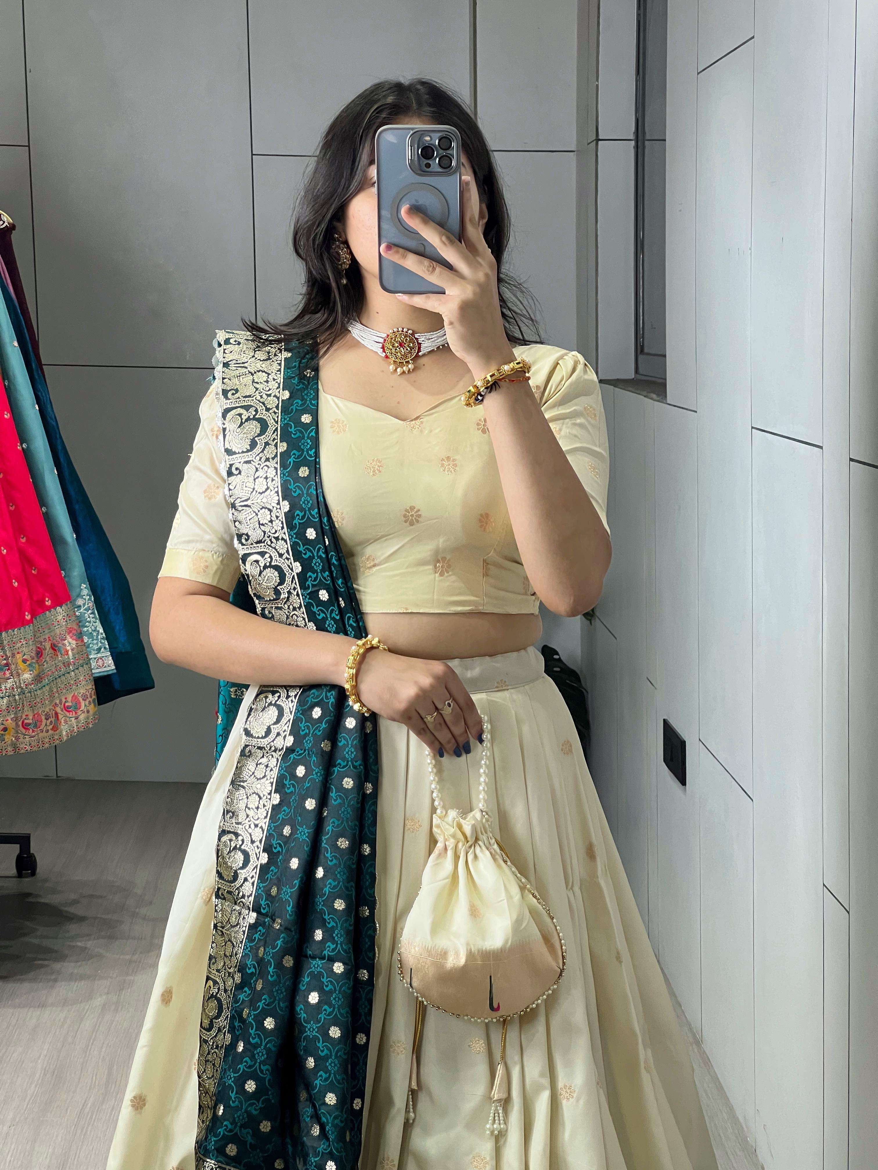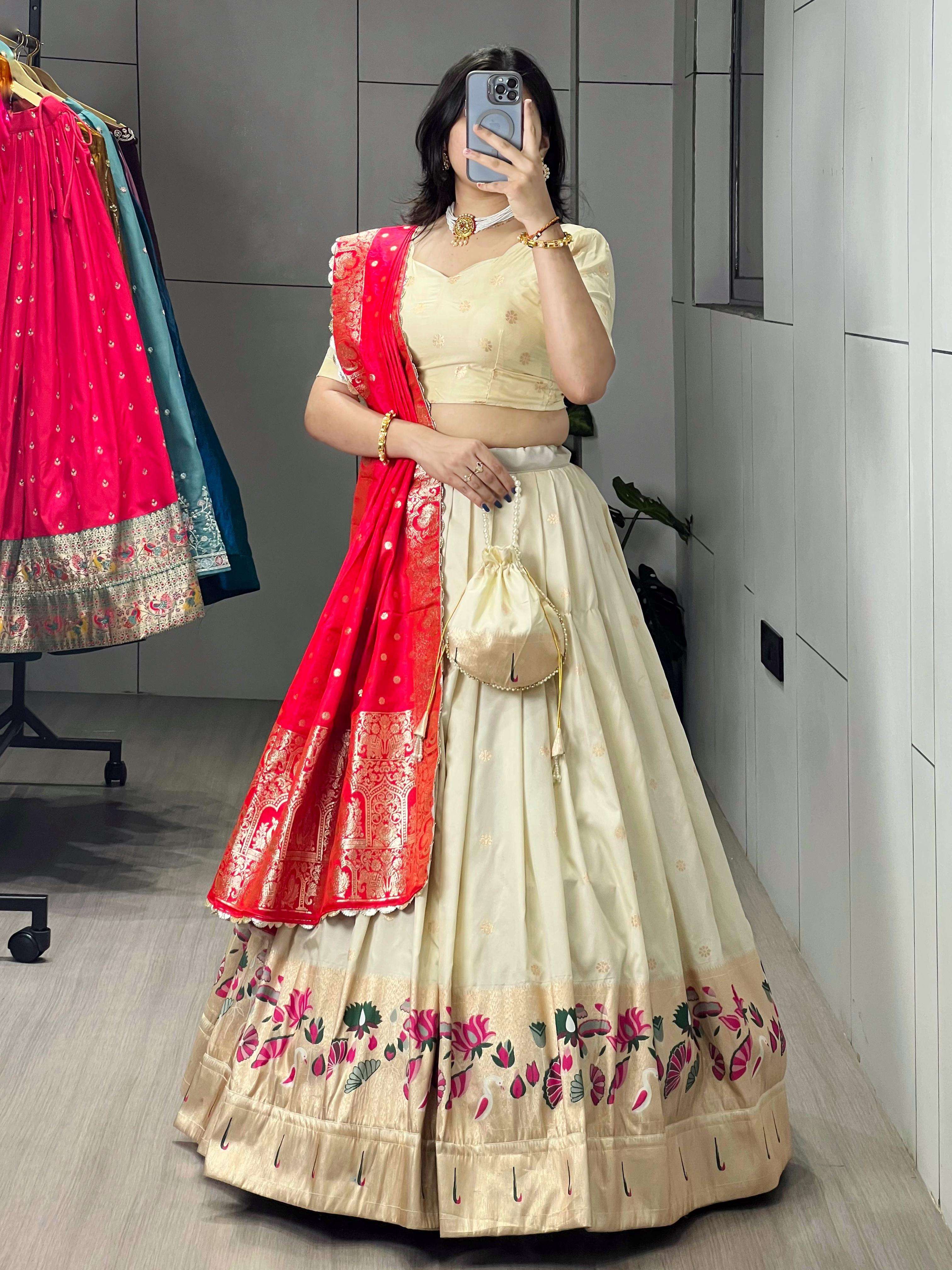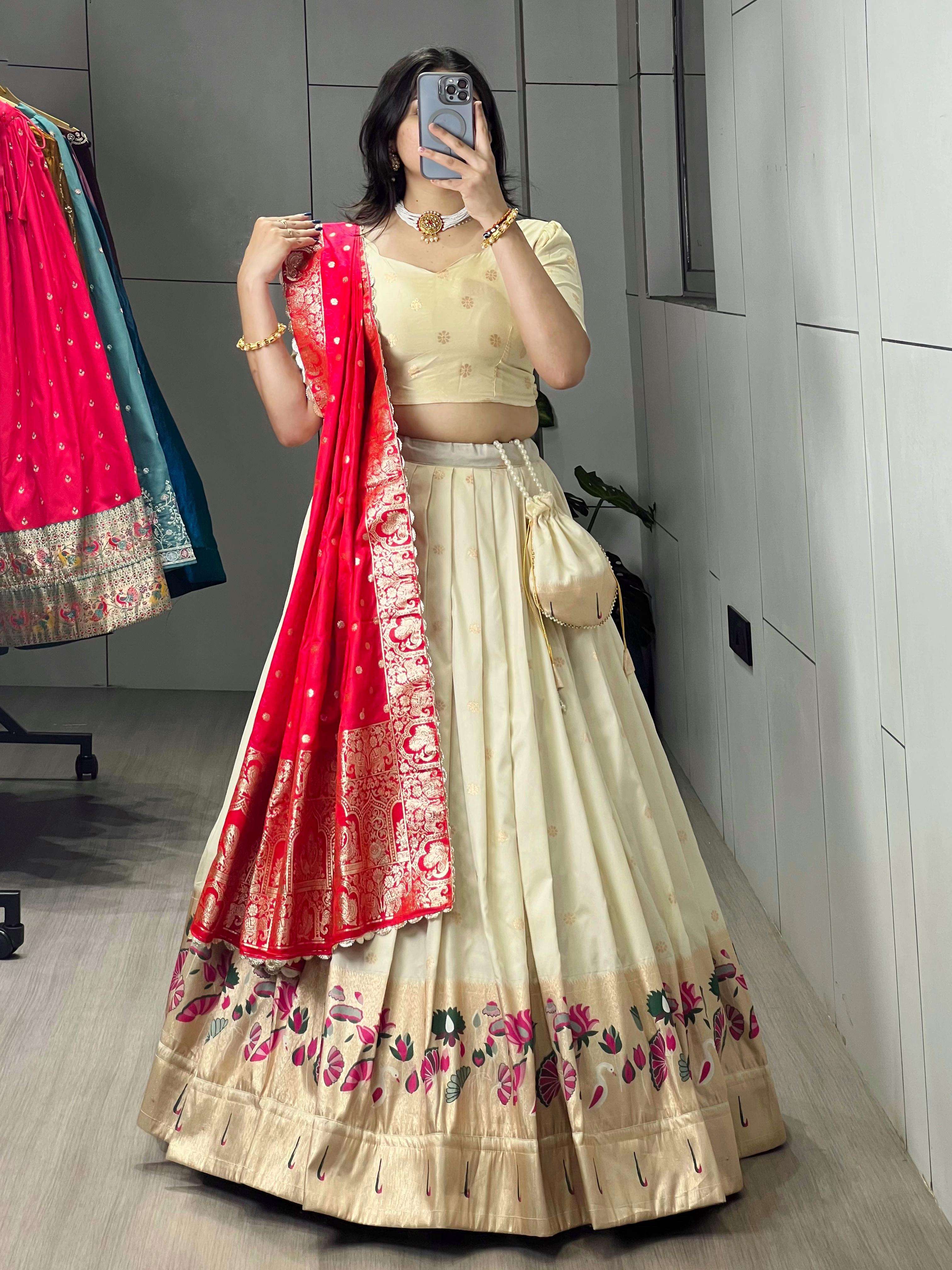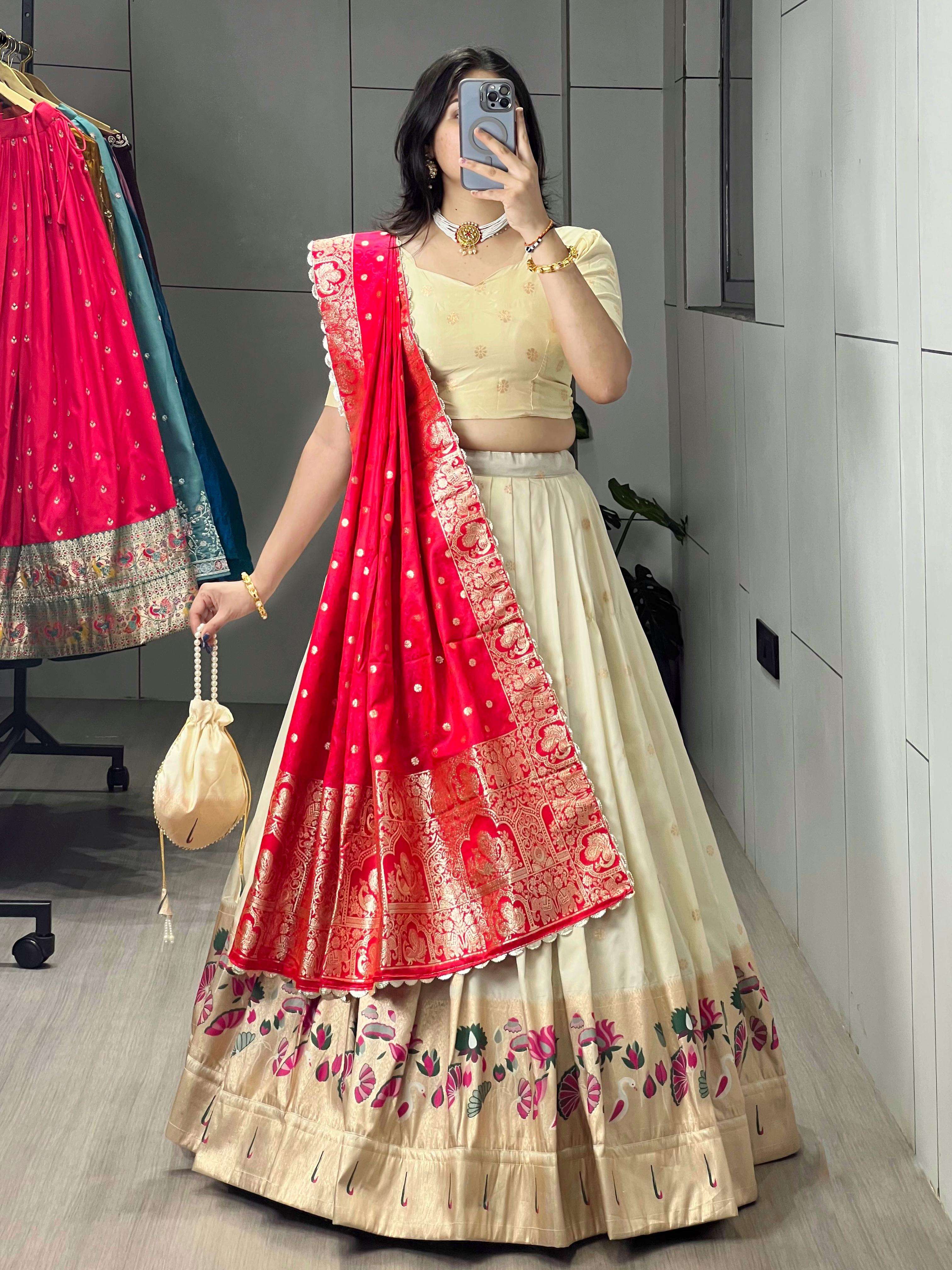 _Presenting the richness of Paithani heritage, this exquisite Paithani silk lehenga features vibrant woven Colorful motifs and an iconic zari border With Iconic Dupatta._👜