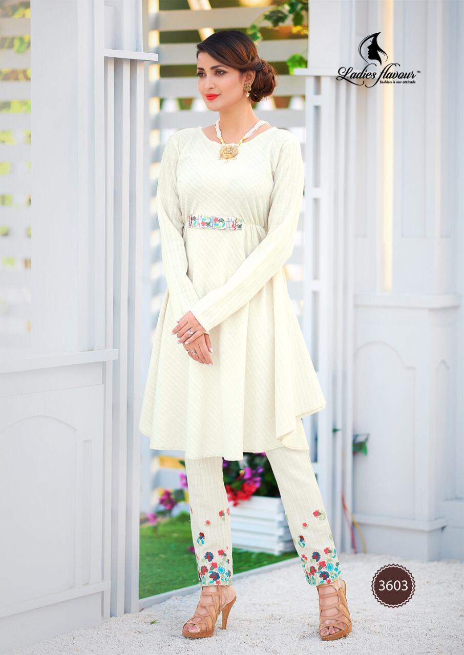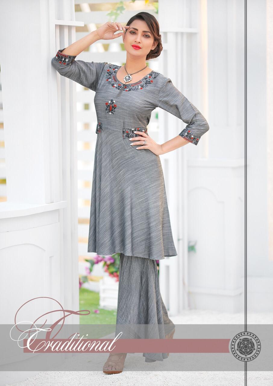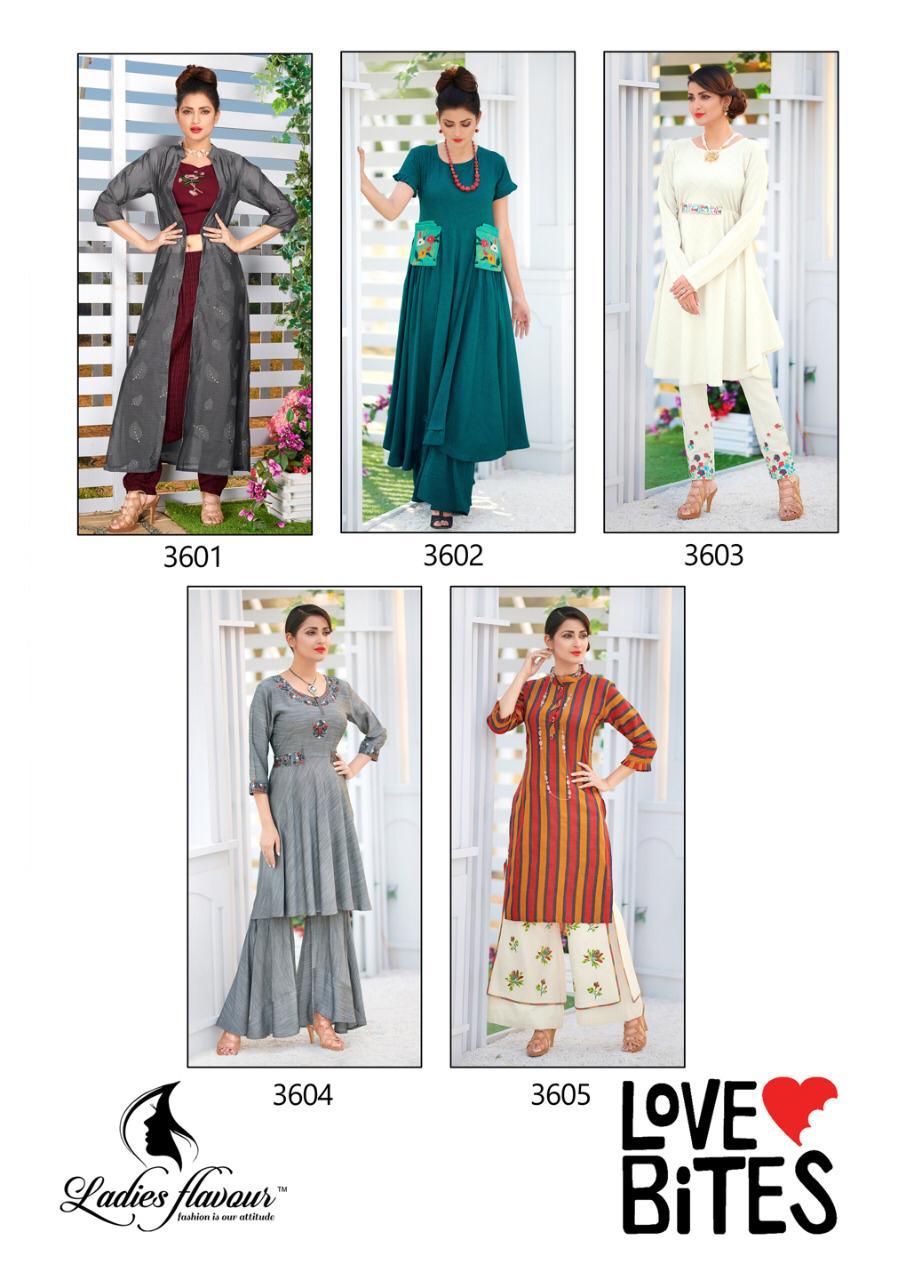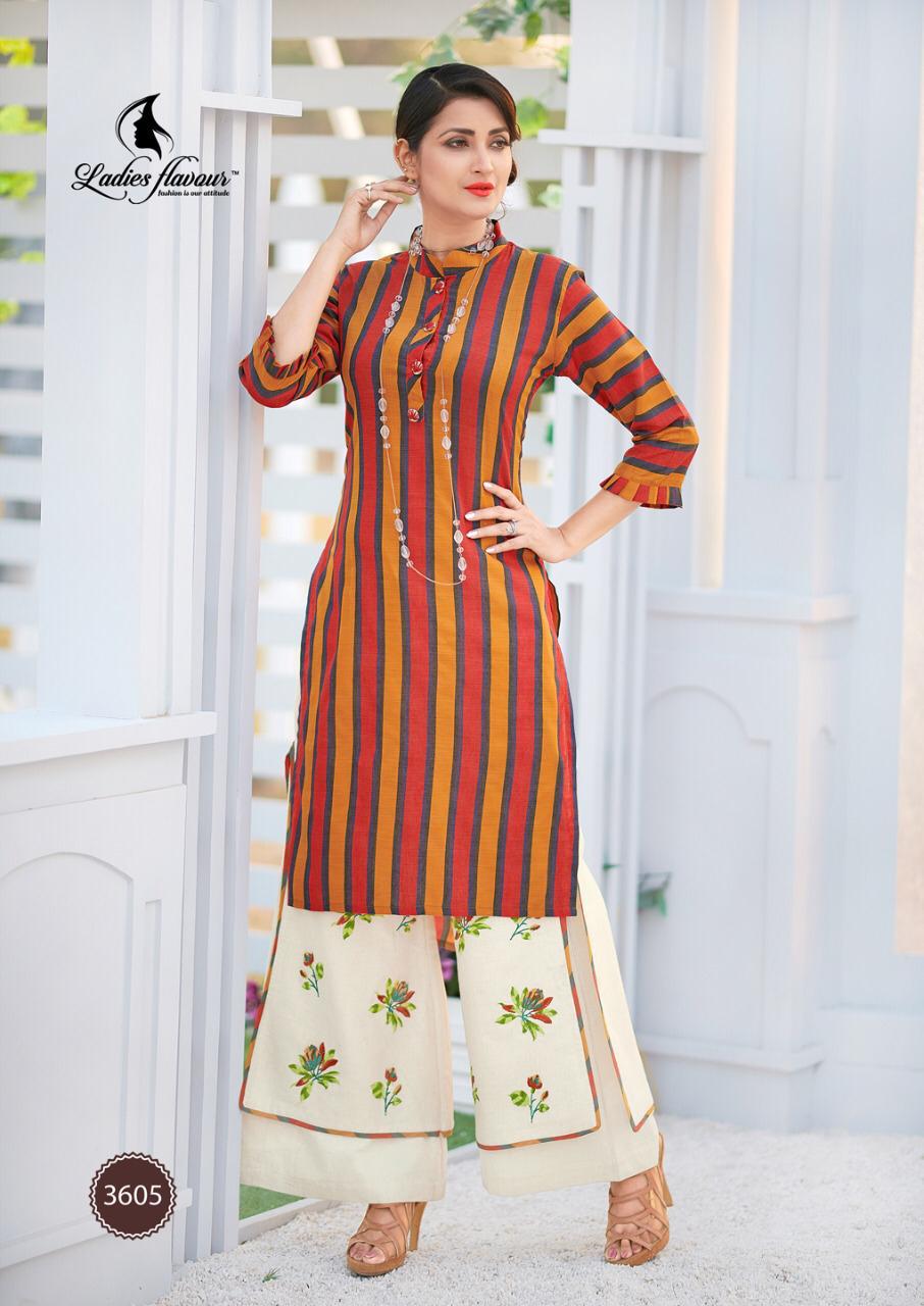 ? *Ladies Flavour* ? Brand Name : *Ladies Flavour* Catalog : *Love-Bites* Design : *5* Fabric : *Rayon Tim tim* *Rayon denim slub* *Rayon natural* *Rayon Stripe* *Cotton Flax* *Orangza* Size : *M(38),L(40), XL(42) , 2XL(44)* Rate :- *885 +5% Gst extra* Dispatch :- today . Set To Set . Note :- *All desing with heavy embroderiy work with Plazzo & Pant* |