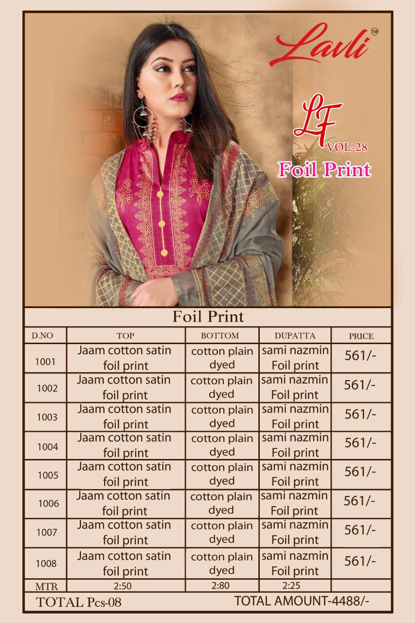 Buy Online Lovli Foil Vol 28 By Lovli 1001 Series Fancy Jam Satin Printed Salwar Kameez Catlog Wholesaler Surat 8 Pcs of Full Catalogue at Wholesale Price. Looking for Lovli Foil Vol 28 By Lovli 1001 Series Fancy Jam Satin Printed Salwar Kameez Catlog Wholesaler Surat Full Catalouge at Best Price? Buy Now Lovli Foil Vol 28 By Lovli 1001 Series Fancy Jam Satin Printed Salwar Kameez Catlog Wholesaler Surat at Wholesale Rate of Rs 4488 with Total 8 Pcs from authroized dealer and supplier of LOVELY FASHION Brand. Cost of Each piece is just only Rs 561 which is very low and affordable price to resale the product in your retail store ,This is Surat based Wholesale Supplier & Dealer of LOVELY FASHION Brand. Click on Brand name to Know more about LOVELY FASHION Brand's products.Call or Whatsapp on 9898838984 for booking or enquiry