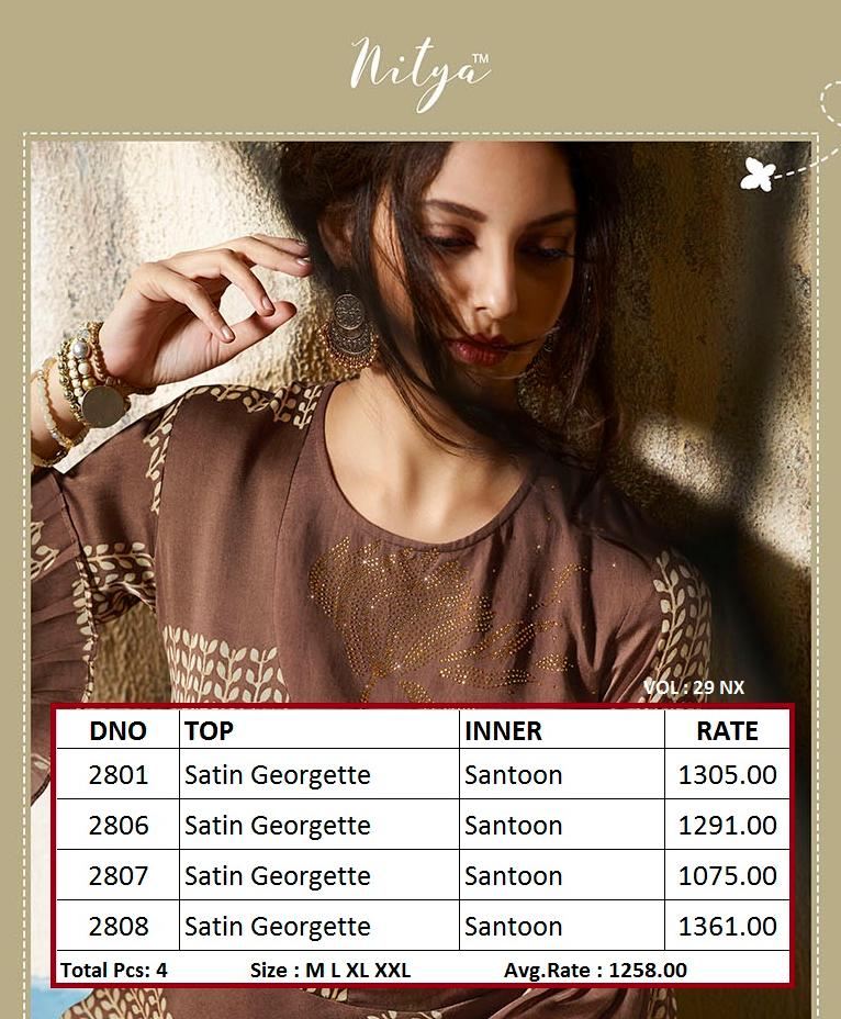 LT NITYA 28 HIT LIST TOP : SATIN GEORGETTE INNER : SANTOON M L XL XXL RATE : 1258/- |