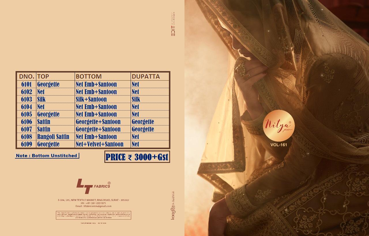 Buy Online Lt Nitya Vol 161 Series 6101 Designer Party Wear Suits Wholesale Supplier Gujarat 9 Pcs of Full Catalogue at Wholesale Price. Looking for Lt Nitya Vol 161 Series 6101 Designer Party Wear Suits Wholesale Supplier Gujarat Full Catalouge at Best Price? Buy Now Lt Nitya Vol 161 Series 6101 Designer Party Wear Suits Wholesale Supplier Gujarat at Wholesale Rate of Rs 27000 with Total 9 Pcs from authroized dealer and supplier of LT FABRICS Brand. Cost of Each piece is just only Rs 3000 which is very low and affordable price to resale the product in your retail store ,This is Surat based Wholesale Supplier & Dealer of LT FABRICS Brand. Click on Brand name to Know more about LT FABRICS Brand's products.Call or Whatsapp on 9898838984 for booking or enquiry