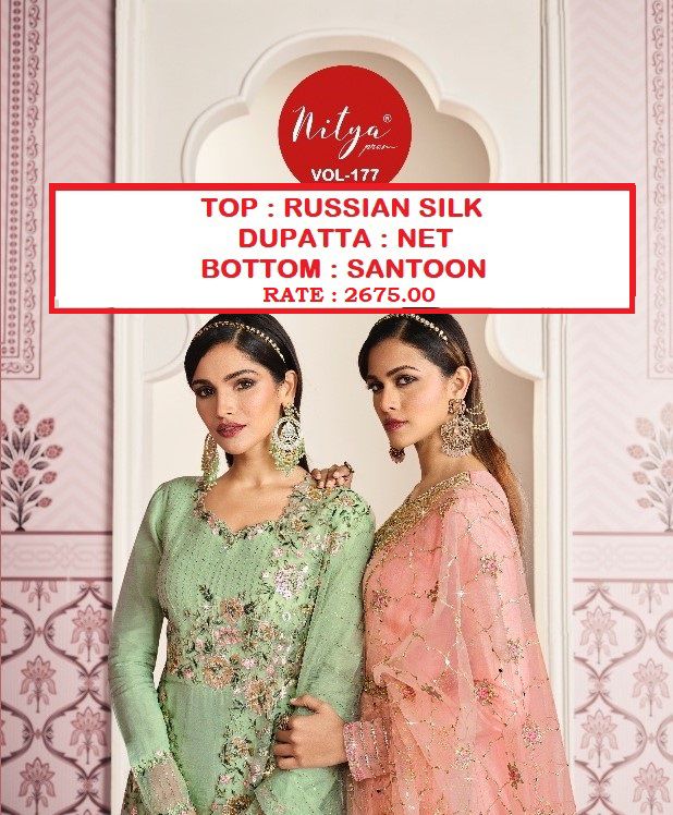 Buy Online Lt Nitya Vol 177 Silk Suit Single And Set Stockiest And Supplier From Surat 6 Pcs of Full Catalogue at Wholesale Price. Looking for Lt Nitya Vol 177 Silk Suit Single And Set Stockiest And Supplier From Surat Full Catalouge at Best Price? Buy Now Lt Nitya Vol 177 Silk Suit Single And Set Stockiest And Supplier From Surat at Wholesale Rate of Rs 16050 with Total 6 Pcs from authroized dealer and supplier of Brand. Cost of Each piece is just only Rs 2675 which is very low and affordable price to resale the product in your retail store ,This is Surat based Wholesale Supplier & Dealer of Brand. Click on Brand name to Know more about Brand's products.Call or Whatsapp on 9898838984 for booking or enquiry