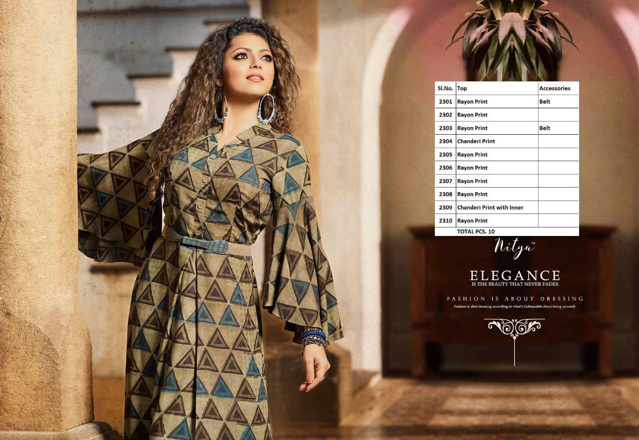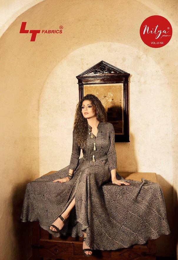 Buy Online Lt Nitya Vol 23 Nx 2301 To 2310 Series Gown Type Kurti Saller 10 Pcs of Full Catalogue at Wholesale Price. Looking for Lt Nitya Vol 23 Nx 2301 To 2310 Series Gown Type Kurti Saller Full Catalouge at Best Price? Buy Now Lt Nitya Vol 23 Nx 2301 To 2310 Series Gown Type Kurti Saller at Wholesale Rate of Rs 11300 with Total 10 Pcs from authroized dealer and supplier of LT FABRICS Brand. Cost of Each piece is just only Rs 1130 which is very low and affordable price to resale the product in your retail store ,This is Surat based Wholesale Supplier & Dealer of LT FABRICS Brand. Click on Brand name to Know more about LT FABRICS Brand's products.Call or Whatsapp on 9898838984 for booking or enquiry