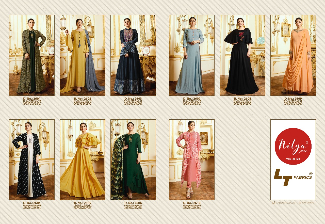 Buy Online Lt Nitya Vol 26 Nx Series 2601 To 2610 Wholesale Supplier 10 Pcs of Full Catalogue at Wholesale Price. Looking for Lt Nitya Vol 26 Nx Series 2601 To 2610 Wholesale Supplier Full Catalouge at Best Price? Buy Now Lt Nitya Vol 26 Nx Series 2601 To 2610 Wholesale Supplier at Wholesale Rate of Rs 12990 with Total 10 Pcs from authroized dealer and supplier of LT FABRICS Brand. Cost of Each piece is just only Rs 1299 which is very low and affordable price to resale the product in your retail store ,This is Surat based Wholesale Supplier & Dealer of LT FABRICS Brand. Click on Brand name to Know more about LT FABRICS Brand's products.Call or Whatsapp on 9898838984 for booking or enquiry