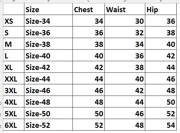 Size: - XS(34),S(36),M(38),L(40),XL(42),XXL(44), 3XL(46), 4XL(48), 5XL(50), 6xl(52) (all size available)