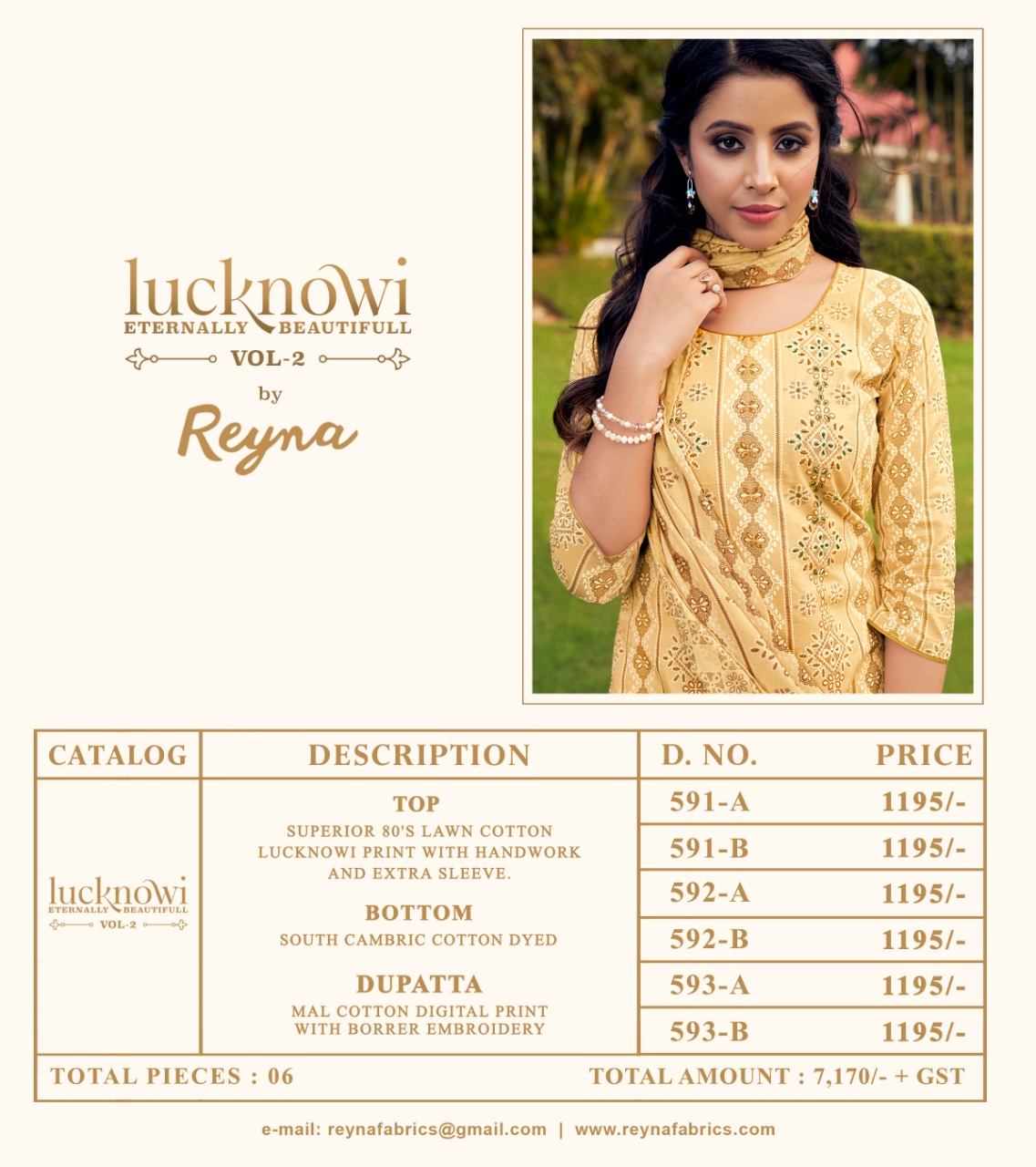 Buy Online Lucknowi Vol 2 By Reyna Wholesale Supplier Traders In Surat 6 Pcs of Full Catalogue at Wholesale Price. Looking for Lucknowi Vol 2 By Reyna Wholesale Supplier Traders In Surat Full Catalouge at Best Price? Buy Now Lucknowi Vol 2 By Reyna Wholesale Supplier Traders In Surat at Wholesale Rate of Rs 7170 with Total 6 Pcs from authroized dealer and supplier of Brand. Cost of Each piece is just only Rs 1195 which is very low and affordable price to resale the product in your retail store ,This is Surat based Wholesale Supplier & Dealer of Brand. Click on Brand name to Know more about Brand's products.Call or Whatsapp on 9898838984 for booking or enquiry