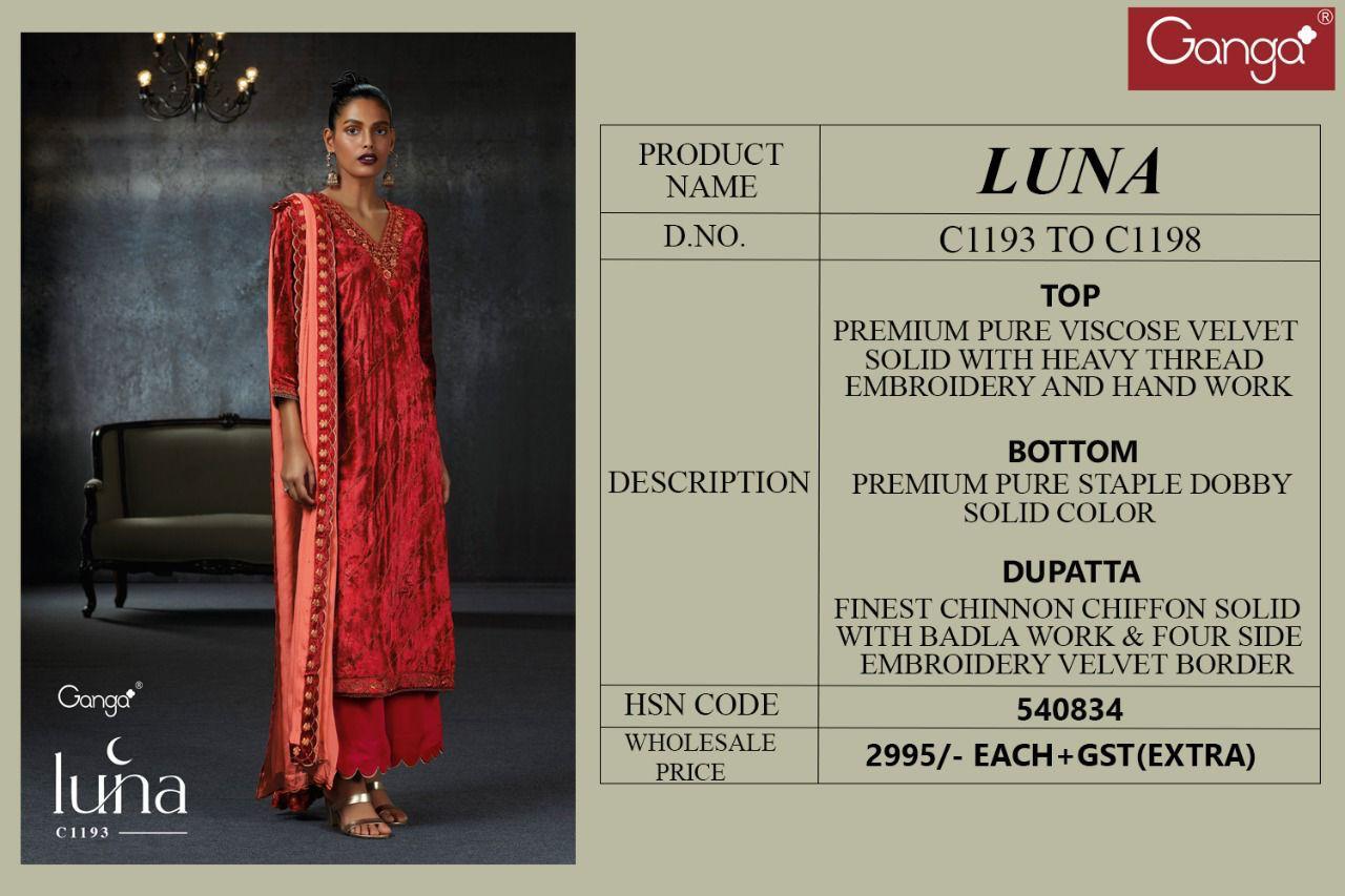 Buy Online Luna By Ganga Premium Pure Viscose Velvet Handwork Suit 6 Pcs of Full Catalogue at Wholesale Price. Looking for Luna By Ganga Premium Pure Viscose Velvet Handwork Suit Full Catalouge at Best Price? Buy Now Luna By Ganga Premium Pure Viscose Velvet Handwork Suit at Wholesale Rate of Rs 0 with Total 6 Pcs from authroized dealer and supplier of GANGA Brand. Cost of Each piece is just only Rs 0 which is very low and affordable price to resale the product in your retail store ,This is Surat based Wholesale Supplier & Dealer of GANGA Brand. Click on Brand name to Know more about GANGA Brand's products.Call or Whatsapp on 9898838984 for booking or enquiry