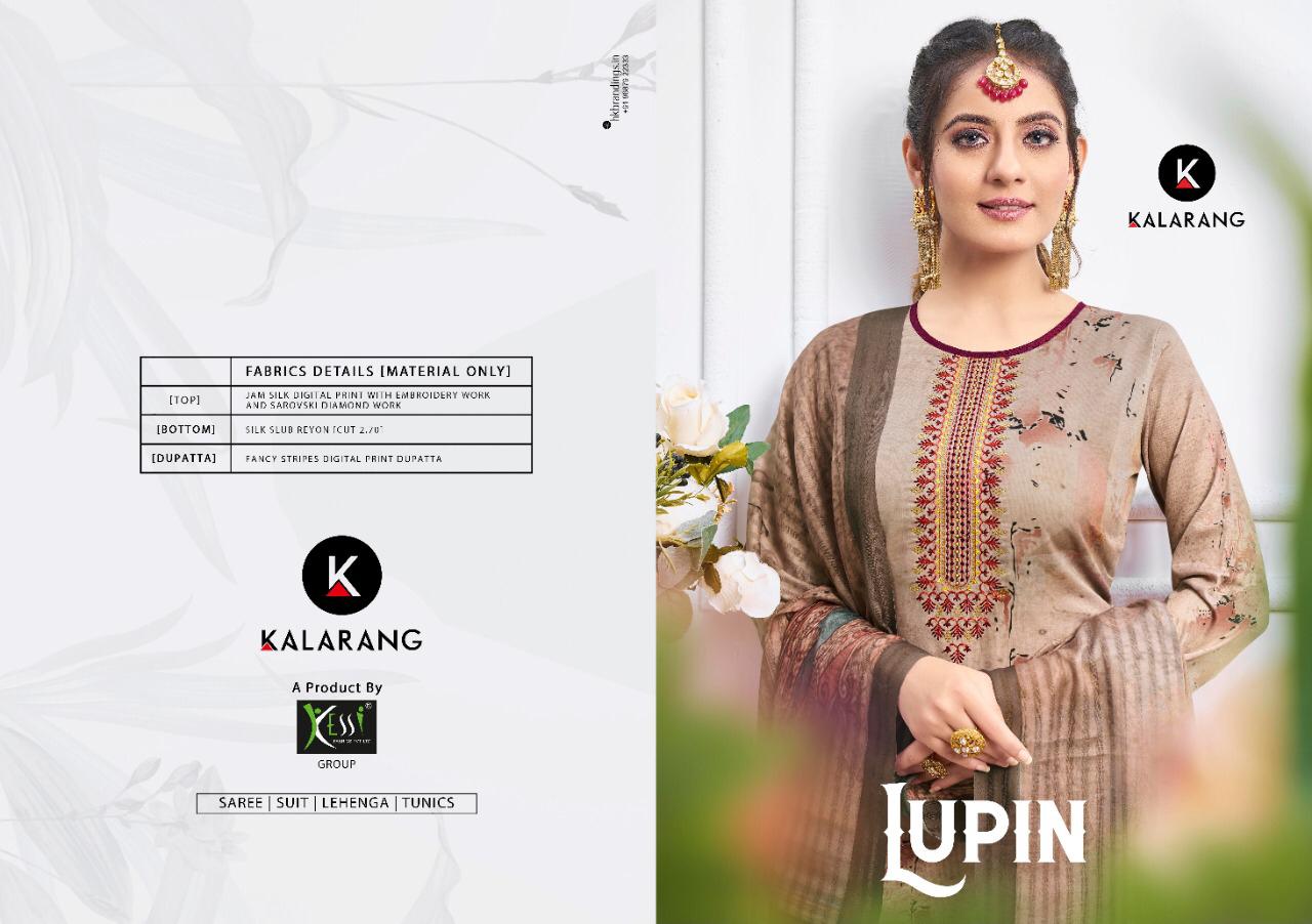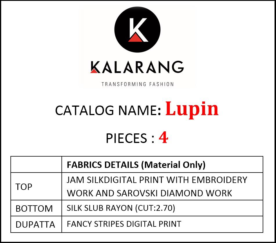 Buy Online Lupin By Kalarang Jam Silk Dress Materials Wholesale Supplier Surat 4 Pcs of Full Catalogue at Wholesale Price. Looking for Lupin By Kalarang Jam Silk Dress Materials Wholesale Supplier Surat Full Catalouge at Best Price? Buy Now Lupin By Kalarang Jam Silk Dress Materials Wholesale Supplier Surat at Wholesale Rate of Rs 3580 with Total 4 Pcs from authroized dealer and supplier of KALARANG Brand. Cost of Each piece is just only Rs 895 which is very low and affordable price to resale the product in your retail store ,This is Surat based Wholesale Supplier & Dealer of KALARANG Brand. Click on Brand name to Know more about KALARANG Brand's products.Call or Whatsapp on 9898838984 for booking or enquiry
