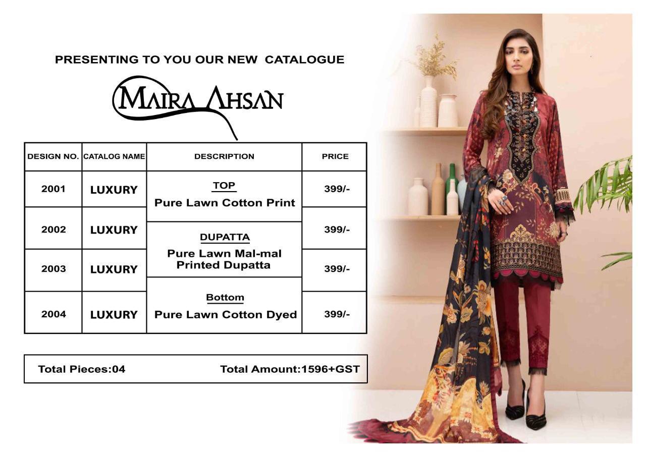 Buy Online Luxury Lawn By Maira Ahsan Manufacturer Traders Surat Gujrat 4 Pcs of Full Catalogue at Wholesale Price. Looking for Luxury Lawn By Maira Ahsan Manufacturer Traders Surat Gujrat Full Catalouge at Best Price? Buy Now Luxury Lawn By Maira Ahsan Manufacturer Traders Surat Gujrat at Wholesale Rate of Rs 1596 with Total 4 Pcs from authroized dealer and supplier of Brand. Cost of Each piece is just only Rs 399 which is very low and affordable price to resale the product in your retail store ,This is Surat based Wholesale Supplier & Dealer of Brand. Click on Brand name to Know more about Brand's products.Call or Whatsapp on 9898838984 for booking or enquiry