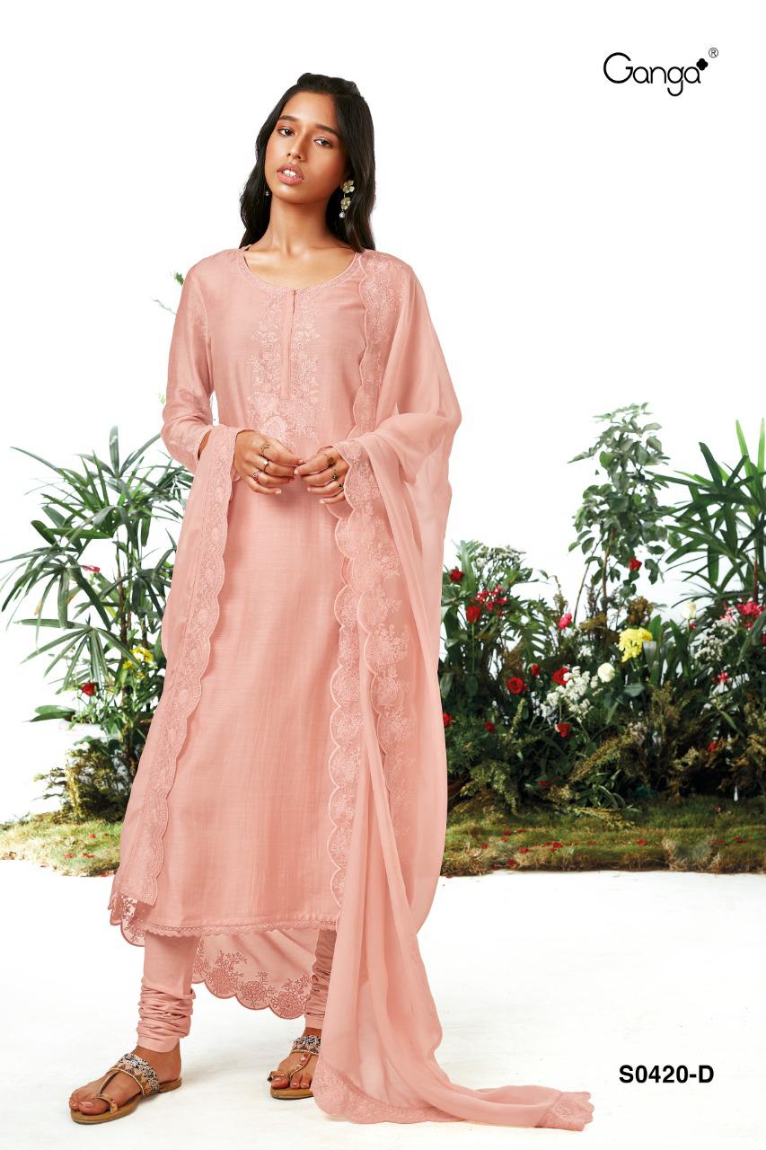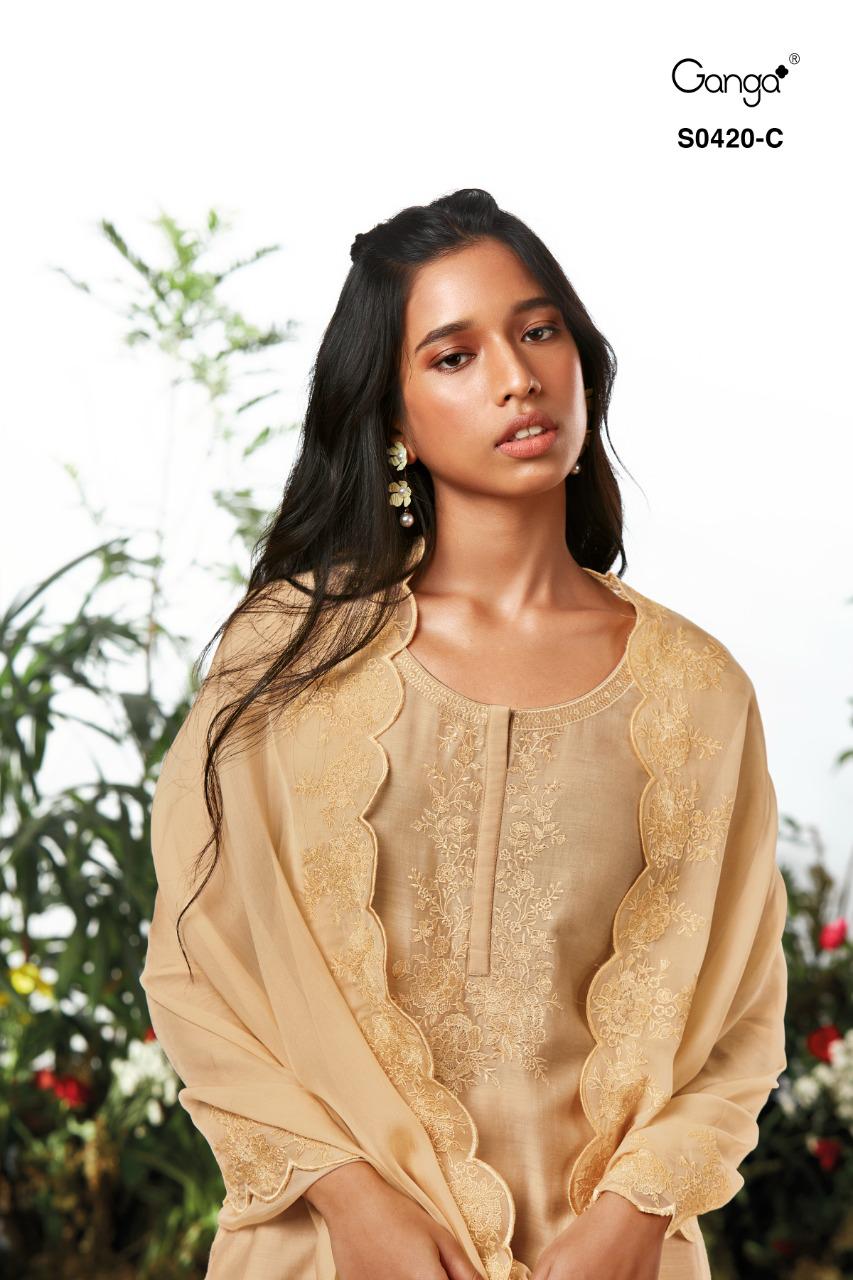 *GANGA* LYLA 420 *TOP:* BEMBERG SILK WITH HEAVY EMBROIDERY *BOTTOM:* PREMIUM COTTON SATIN *DUPATTA:* BEMBERG ORGANZA WITH HEAVY EMBROIDERY |
