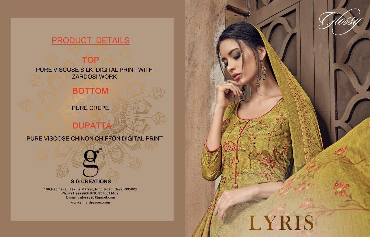 Buy Online Lyris By Glossy 810 Series Fancy Pure Viscose Silk Digital Printed Salwar Kameez Catlog Wholesale Dealer Surat 8 Pcs of Full Catalogue at Wholesale Price. Looking for Lyris By Glossy 810 Series Fancy Pure Viscose Silk Digital Printed Salwar Kameez Catlog Wholesale Dealer Surat Full Catalouge at Best Price? Buy Now Lyris By Glossy 810 Series Fancy Pure Viscose Silk Digital Printed Salwar Kameez Catlog Wholesale Dealer Surat at Wholesale Rate of Rs 14360 with Total 8 Pcs from authroized dealer and supplier of GLOSSY Brand. Cost of Each piece is just only Rs 1795 which is very low and affordable price to resale the product in your retail store ,This is Surat based Wholesale Supplier & Dealer of GLOSSY Brand. Click on Brand name to Know more about GLOSSY Brand's products.Call or Whatsapp on 9898838984 for booking or enquiry