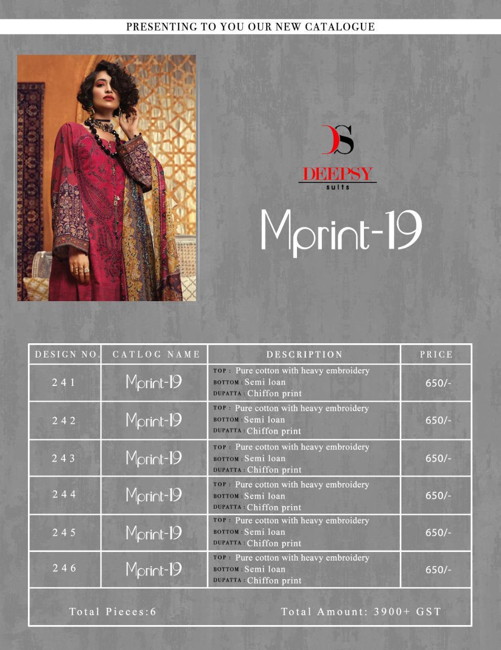 Buy Online M Print 19 By Deepsy Series 241 To 246 Pakistani Suits Wholesale Supplier Gujarat 6 Pcs of Full Catalogue at Wholesale Price. Looking for M Print 19 By Deepsy Series 241 To 246 Pakistani Suits Wholesale Supplier Gujarat Full Catalouge at Best Price? Buy Now M Print 19 By Deepsy Series 241 To 246 Pakistani Suits Wholesale Supplier Gujarat at Wholesale Rate of Rs 3900 with Total 6 Pcs from authroized dealer and supplier of DEEPSY Brand. Cost of Each piece is just only Rs 650 which is very low and affordable price to resale the product in your retail store ,This is Surat based Wholesale Supplier & Dealer of DEEPSY Brand. Click on Brand name to Know more about DEEPSY Brand's products.Call or Whatsapp on 9898838984 for booking or enquiry