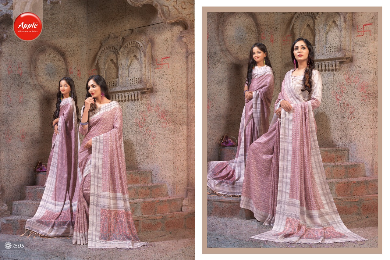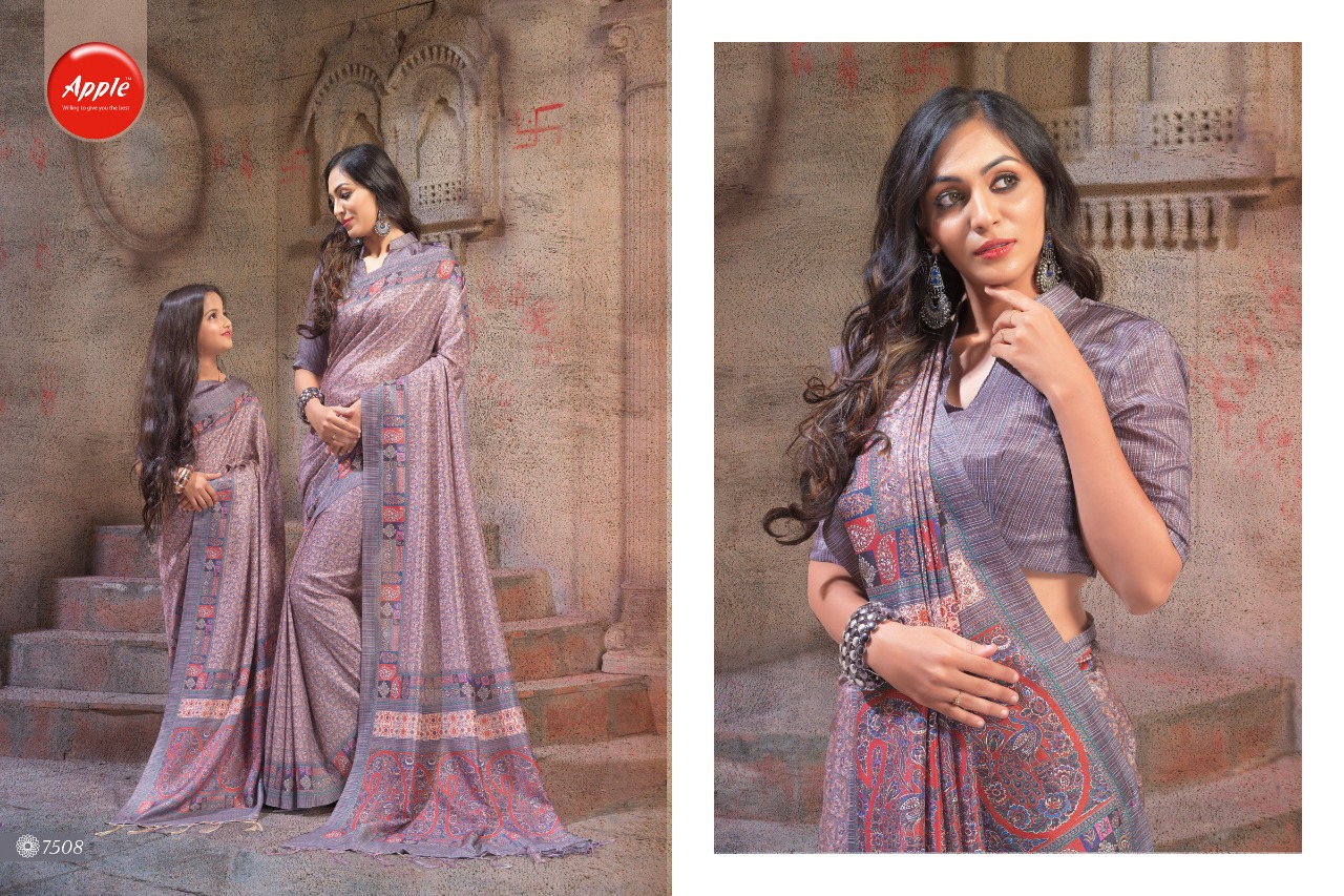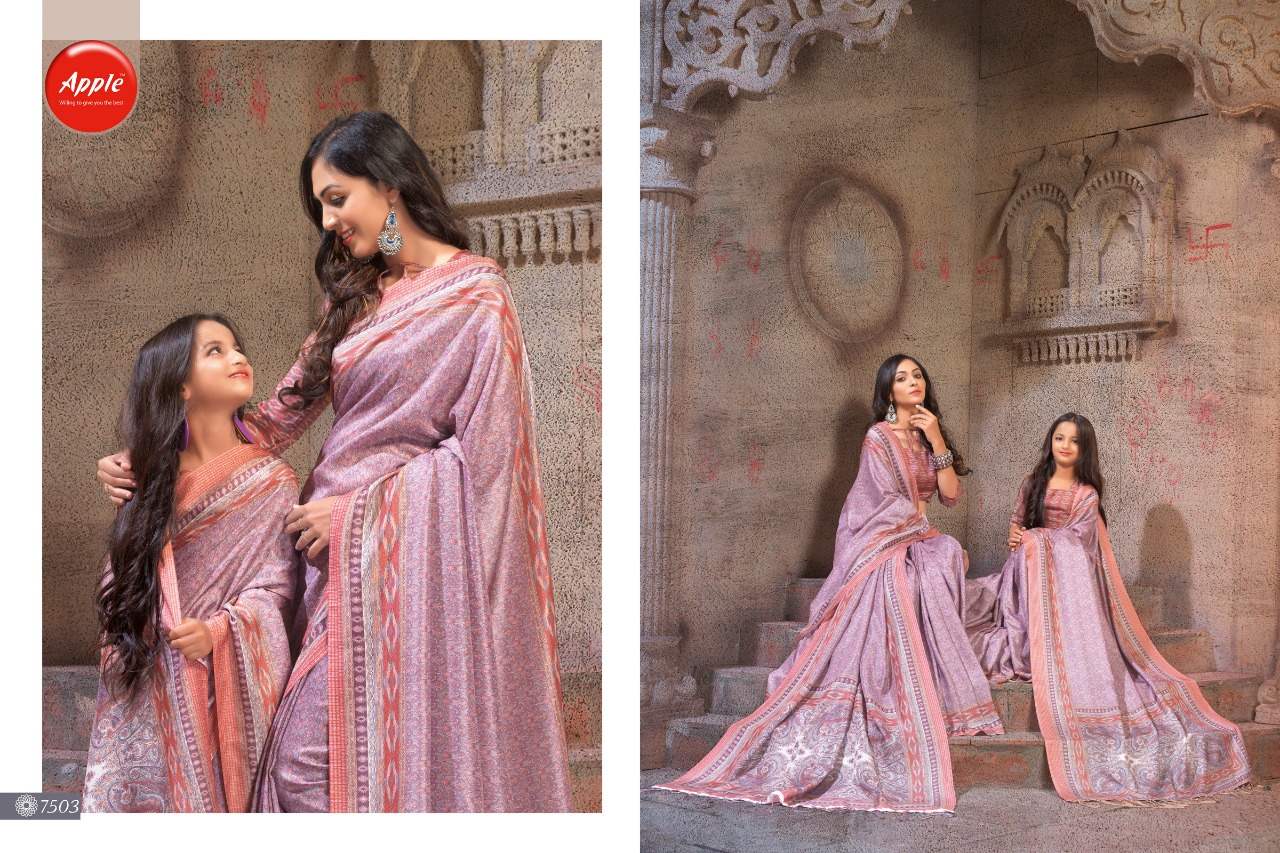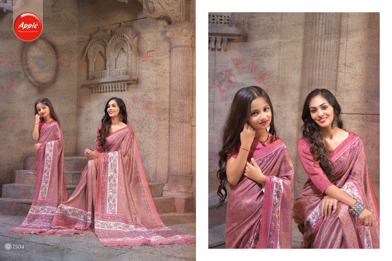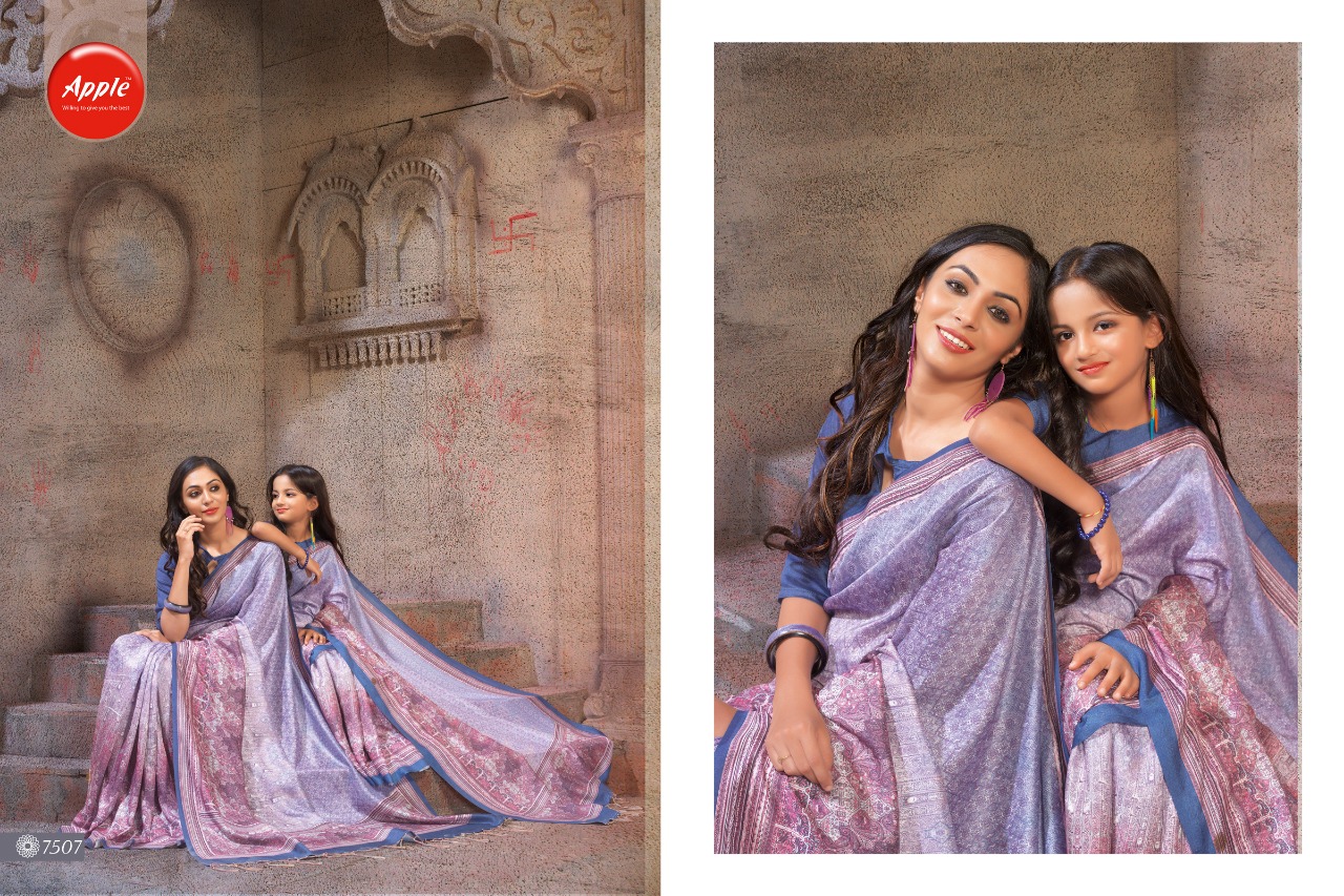 Buy Online Maa And Baby Collection By Apple Saree 7501 Series Designer Pashmin Silk Saree Catlog Wholesaler Surat 8 Pcs of Full Catalogue at Wholesale Price. Looking for Maa And Baby Collection By Apple Saree 7501 Series Designer Pashmin Silk Saree Catlog Wholesaler Surat Full Catalouge at Best Price? Buy Now Maa And Baby Collection By Apple Saree 7501 Series Designer Pashmin Silk Saree Catlog Wholesaler Surat at Wholesale Rate of Rs 5720 with Total 8 Pcs from authroized dealer and supplier of APPLE Brand. Cost of Each piece is just only Rs 715 which is very low and affordable price to resale the product in your retail store ,This is Surat based Wholesale Supplier & Dealer of APPLE Brand. Click on Brand name to Know more about APPLE Brand's products.Call or Whatsapp on 9898838984 for booking or enquiry
