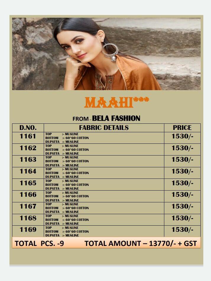 Buy Online Maahi By Bela Series 1161 Designer Party Wear Suits Wholesale Supplier Gujarat 9 Pcs of Full Catalogue at Wholesale Price. Looking for Maahi By Bela Series 1161 Designer Party Wear Suits Wholesale Supplier Gujarat Full Catalouge at Best Price? Buy Now Maahi By Bela Series 1161 Designer Party Wear Suits Wholesale Supplier Gujarat at Wholesale Rate of Rs 13770 with Total 9 Pcs from authroized dealer and supplier of BELA Brand. Cost of Each piece is just only Rs 1530 which is very low and affordable price to resale the product in your retail store ,This is Surat based Wholesale Supplier & Dealer of BELA Brand. Click on Brand name to Know more about BELA Brand's products.Call or Whatsapp on 9898838984 for booking or enquiry