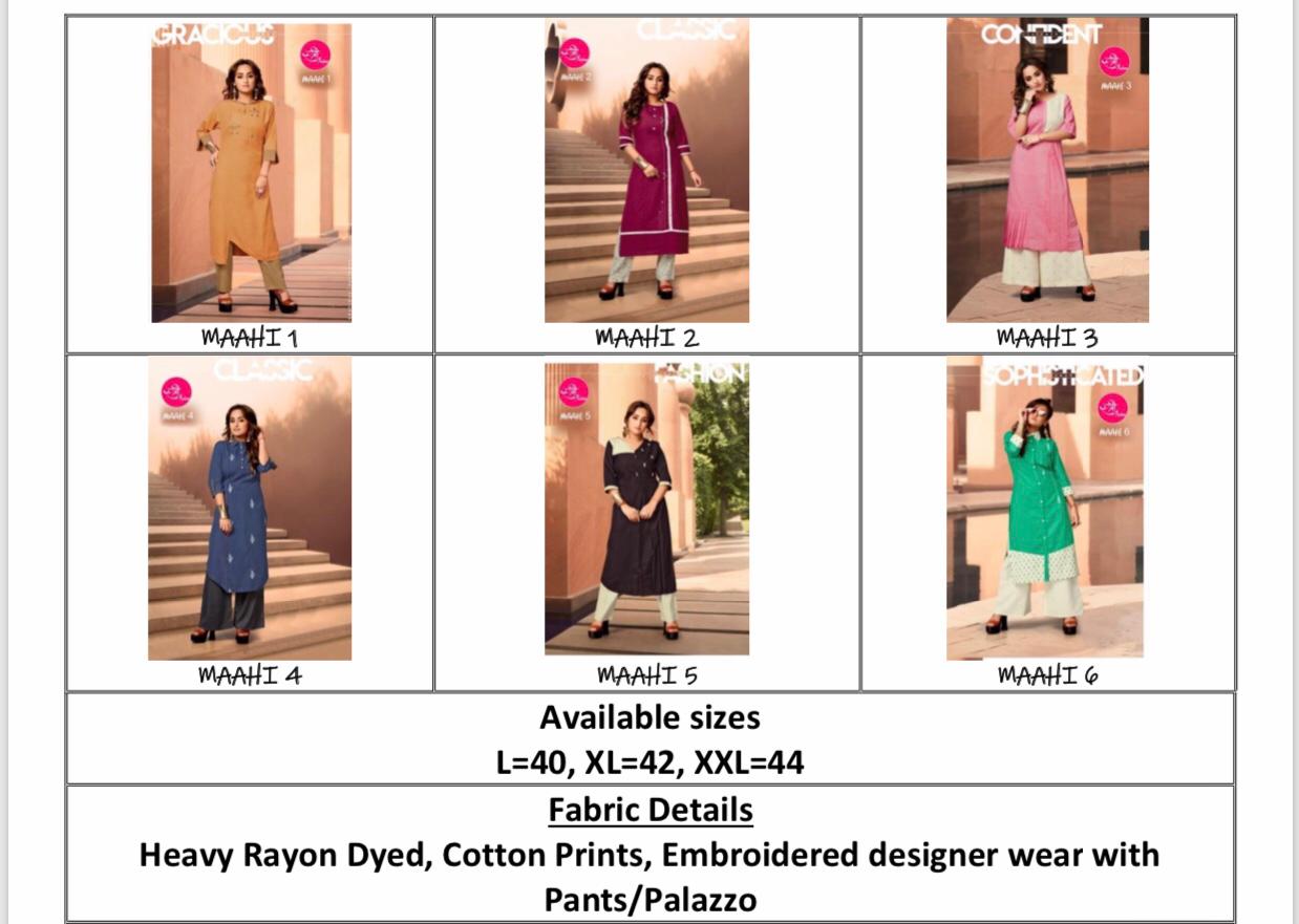 Buy Online Maahi By Stree Fashion Reyon Kurtis With Plazzo Wholesale Supplier Gujarat 6 Pcs of Full Catalogue at Wholesale Price. Looking for Maahi By Stree Fashion Reyon Kurtis With Plazzo Wholesale Supplier Gujarat Full Catalouge at Best Price? Buy Now Maahi By Stree Fashion Reyon Kurtis With Plazzo Wholesale Supplier Gujarat at Wholesale Rate of Rs 3750 with Total 6 Pcs from authroized dealer and supplier of Brand. Cost of Each piece is just only Rs 625 which is very low and affordable price to resale the product in your retail store ,This is Surat based Wholesale Supplier & Dealer of Brand. Click on Brand name to Know more about Brand's products.Call or Whatsapp on 9898838984 for booking or enquiry